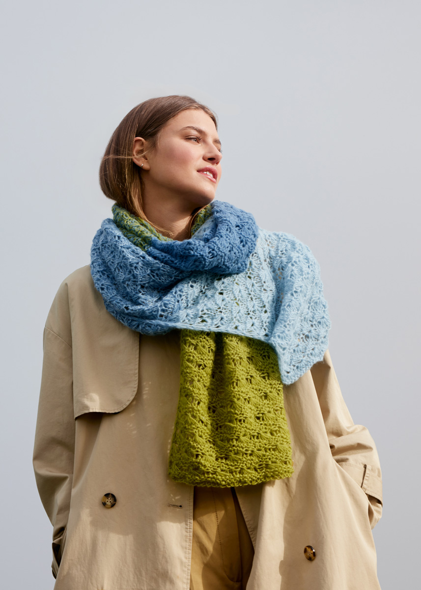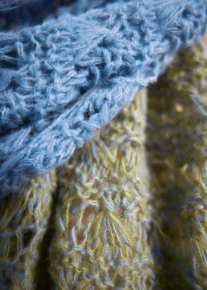 Lana Grossa Soffio (60% ren ny ull (merino superfin), 30% (Bio) bomull, 10% kashmir, löplängd 212 m/25 g), 50 g kiwigrön (färg 8), 50 g duvblå (färg 12) och 50 g ljusblå (färg 13); stickor nr. 8. Modellen stickas med dubbla trådar!