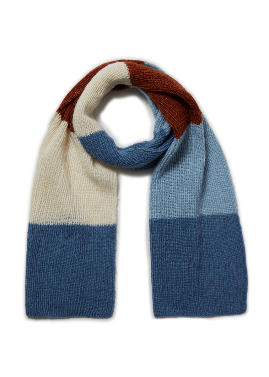 Lana Grossa Soffio (60% ren ny ull (Merino superfein), 30% Bio bomull, 10% kashmir, löplängd 212 m/25 g), 75 g duvblå (färg 12), 75 g ljusblå (färg 13), 50 g rostbrun (färg 4) och 50 g råvit (färg 18); stickor nr. 3,5. OBS: Modellen stickas med dubbla trådar!