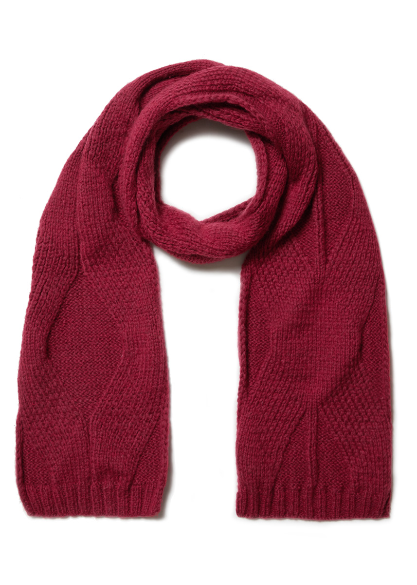 Lana Grossa „Spuma“ (80% ren ny ull (merino superfine), 20% polyamid, löplängd 110 m/50 g), 350 g mörk röd (färg 8); stickor nr. 5 och 7.