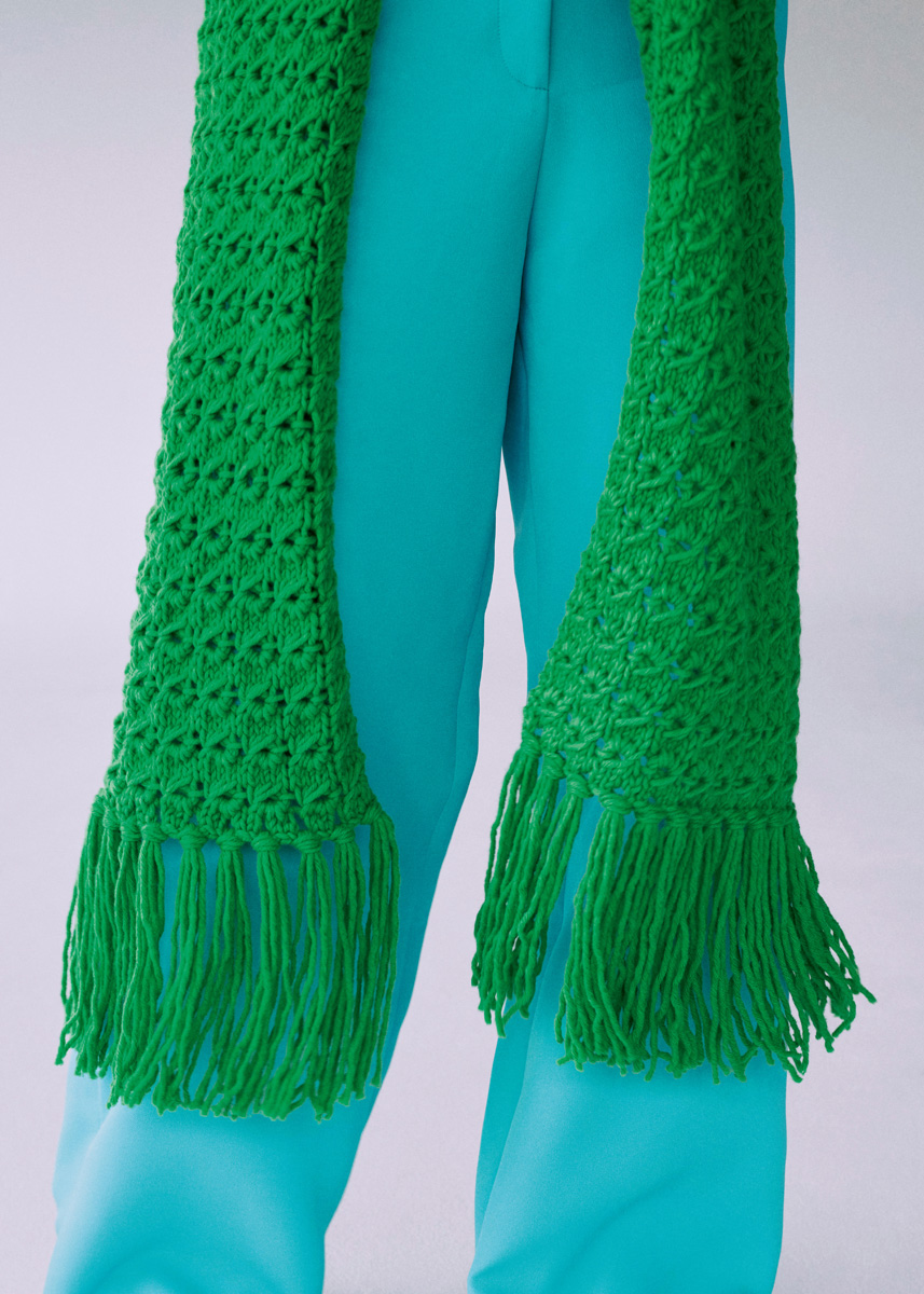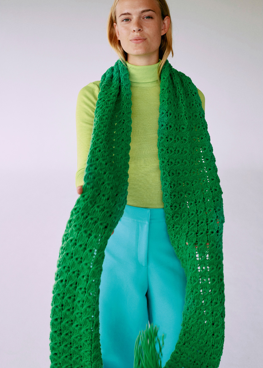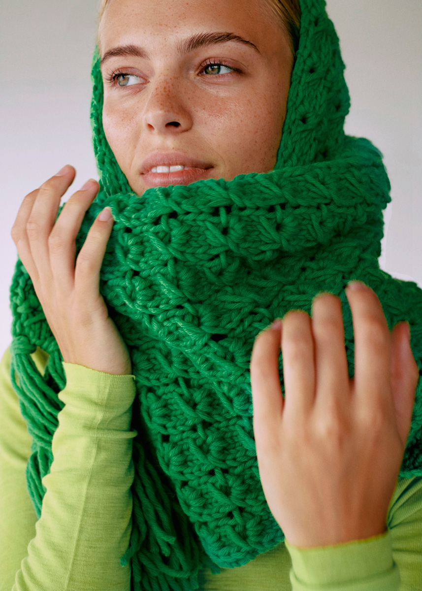Lana Grossa-kvalitet „Woohoo“ (100 % ren ny ull (merino), löplängd = ca 250 m/200 g): ca 600 g grön (färg 10); stickor nr. 7; virknål nr. 7.