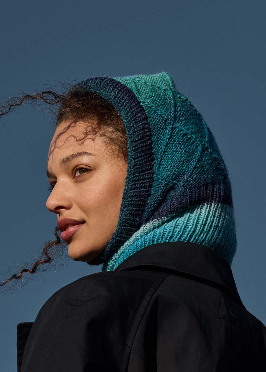 Lana Grossa-kvalitet „Gomitolo Fumo“ (50 % ren ny ull, 50 % polyacryl, løpelengde = ca 700 m/200 g): 1 nøster = ca 200 g mint/tyrkisgrønn/sjøgrønn/lysgrønn/mørkpetrol/anthrasitt (farge 511); 1 kort rundpinne oder settpinner nr. 4,5.