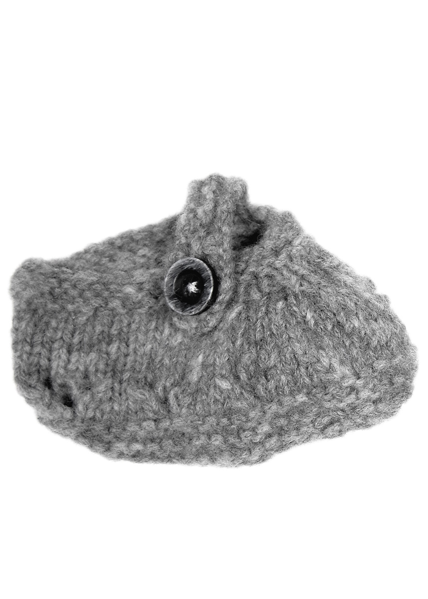 Lana Grossa-kvalitet ”Cashmere 16 Fine” (80 % ren ny merino, ekstrafin, 10 % cashmere, 10 % polyamid, løbelængde = ca. 320 m / 50 gr.): ca. 50 gr lysegrå (fv 15), strømpepinde nr. 3, 2 knapper 12 mm Ø.