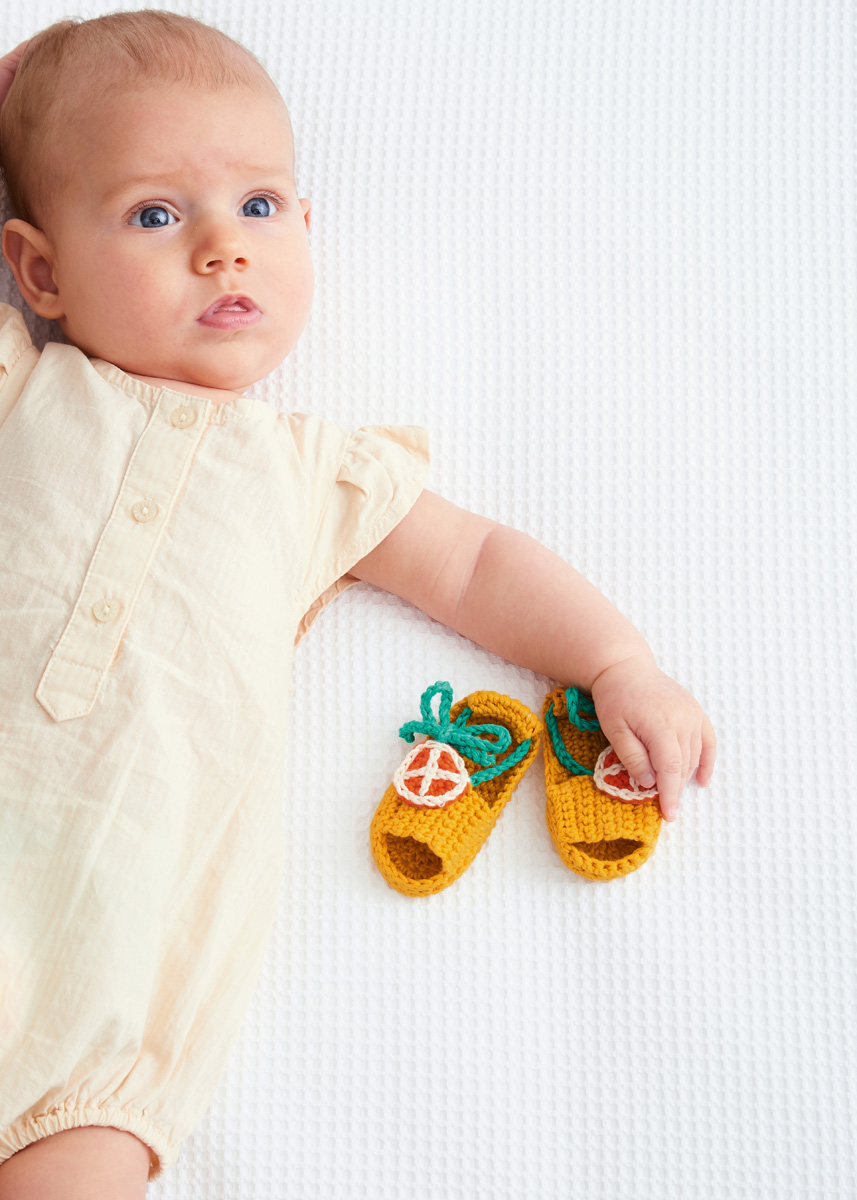 Lana Grossa-kvalitet ”Cotton Love” (100 % (bio) bomuld, løbelængde = ca. 170 m / 50 gr.): 50 gr creme (fv 11), 50 gr majsgul (fv 8), 50 gr koral (fv 2) og 50 gr grøn (fv 5), hæklenål nr. 3 og 3½.