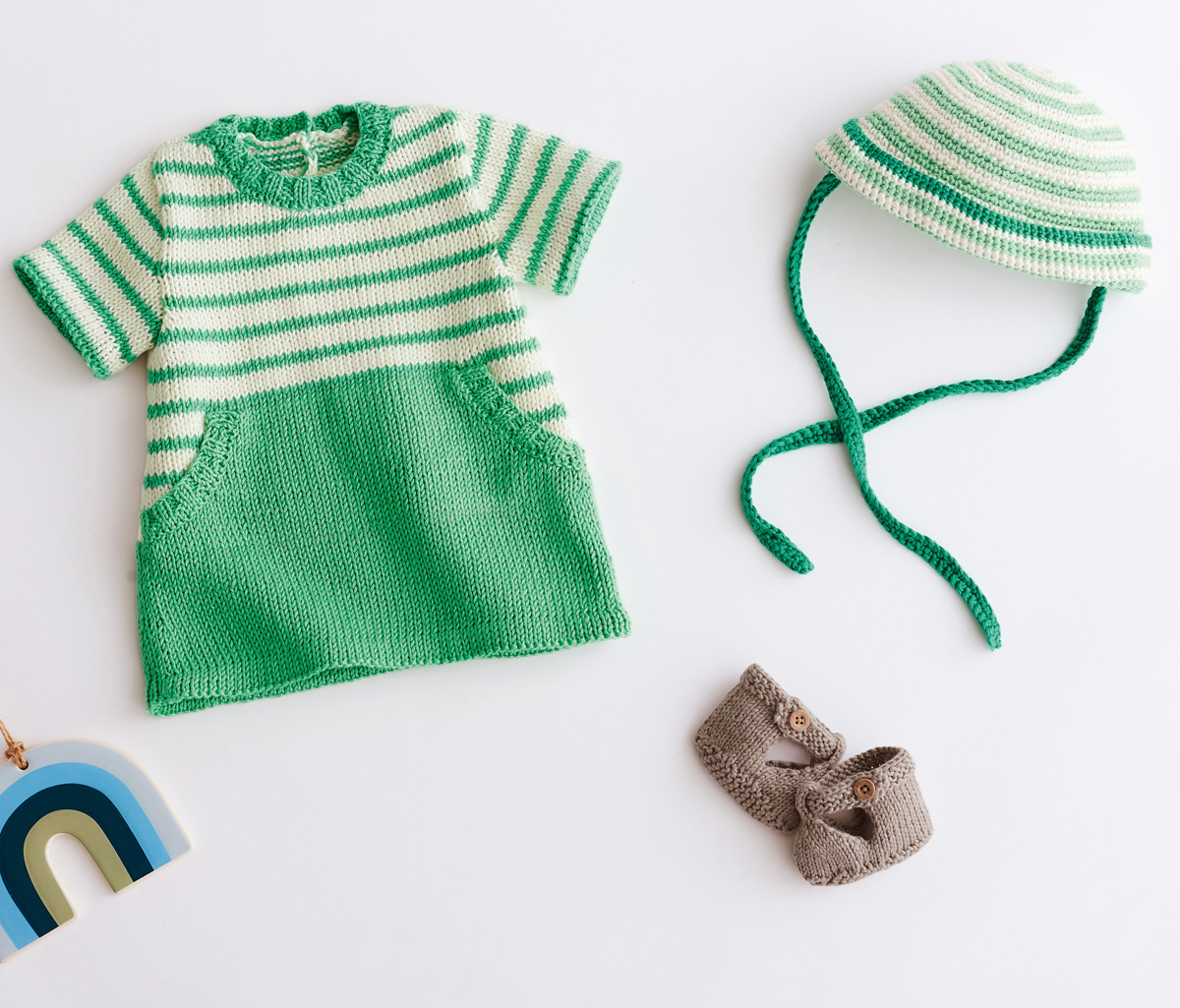 Lana Grossa-kvalitet ”Soft Cotton” (70 % bomuld, 30 % polyakryl, løbelængde = ca. 140 m / 50 gr.): 50 gr gråbeige (fv 4), strømpepinde nr. 3½, 2 knapper 12 mm Ø.