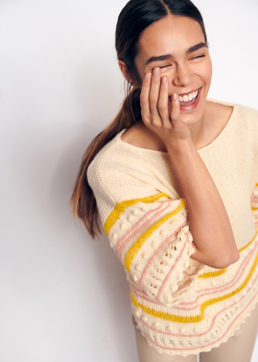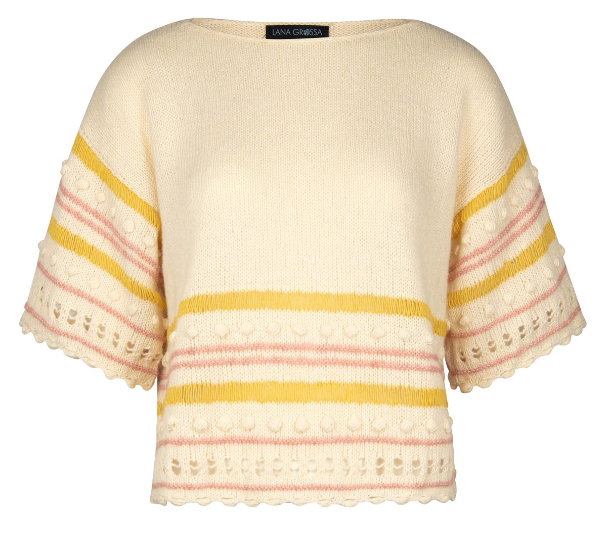 Lana Grossa-kvalitet „Ecopuno” (72 % bomull, 17 % ren ny ull (merino), 11 % (baby) alpacka, löplängd = ca. 215 m/50 g): ca. 250 (300) g ecru (färg 46), ca. 50 g var i persika (färg 7) och ljus gul (färg 52); stickor nr. 4, 1 ullvirknål nr. 4.