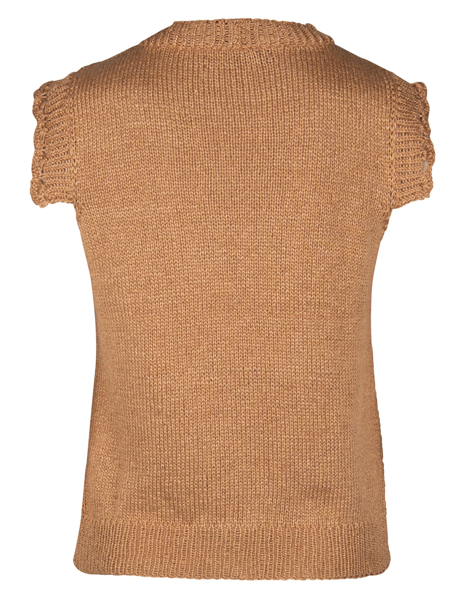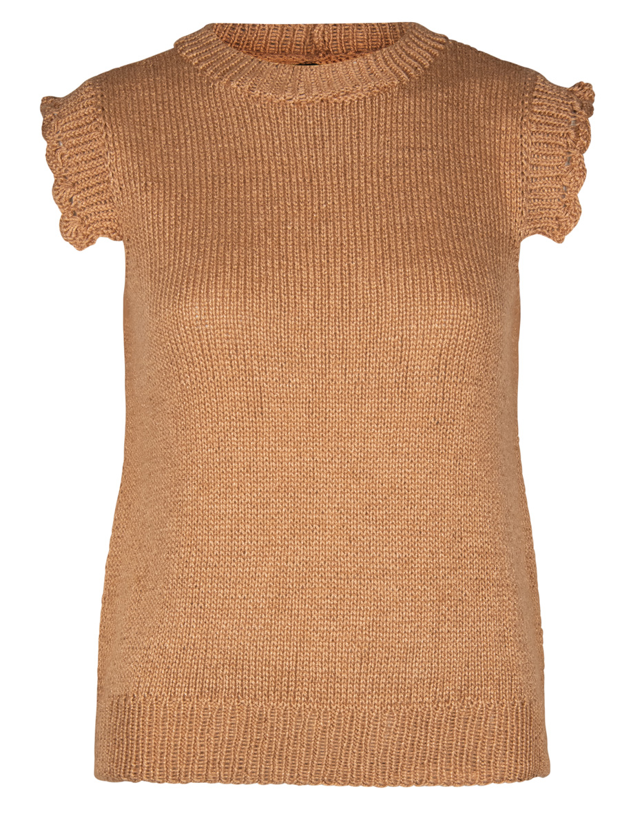 Lana Grossa-kvalitet „Linarte” (40 % viskose, 30 % bomuld, 20 % hør, 10 % polyamid, løbelængde = ca. 125 m/50 g): ca. 300 (350) gr. camel (farve 96); strikkepinde nr. 4 og 5, rundpind nr. 4, 50 cm lang.