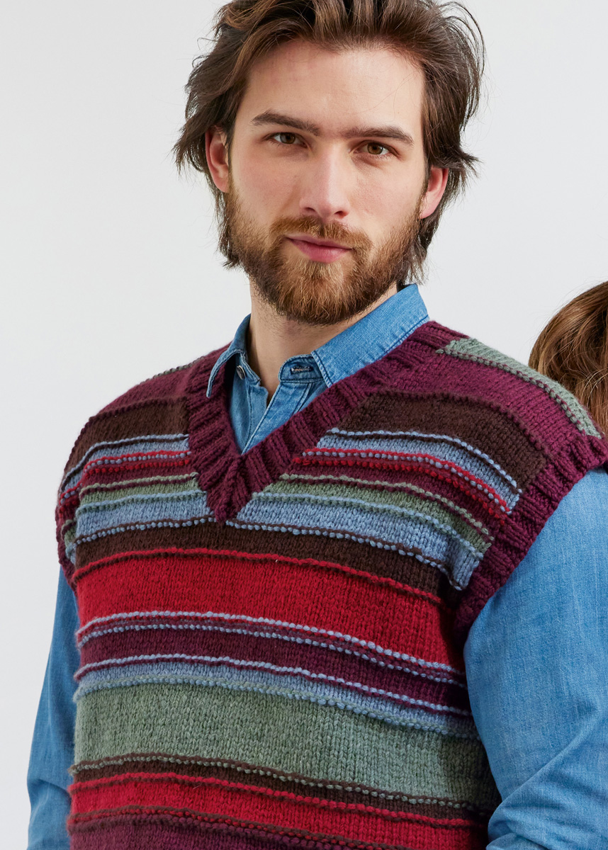 Lana Grossa Alta Moda Cashmere 16 (78% ren ny ull (merino), 12% kashmir, 10% polyamid, löplängd 110 m/50 g), 100 (150 – 200) g burgund (färg 27), 100 (100 – 150) g rökblå (färg 53), 100 (100 – 150) g mocka (färg 47), 100 (100 – 150) g mörk röd (färg 10) och 100 (100 – 150) g grågrön (färg 45); rundstickor nr. 6,5 och 7,5, 80 cm lång, 1 rundsticka nr. 6,5, 40 cm lång.