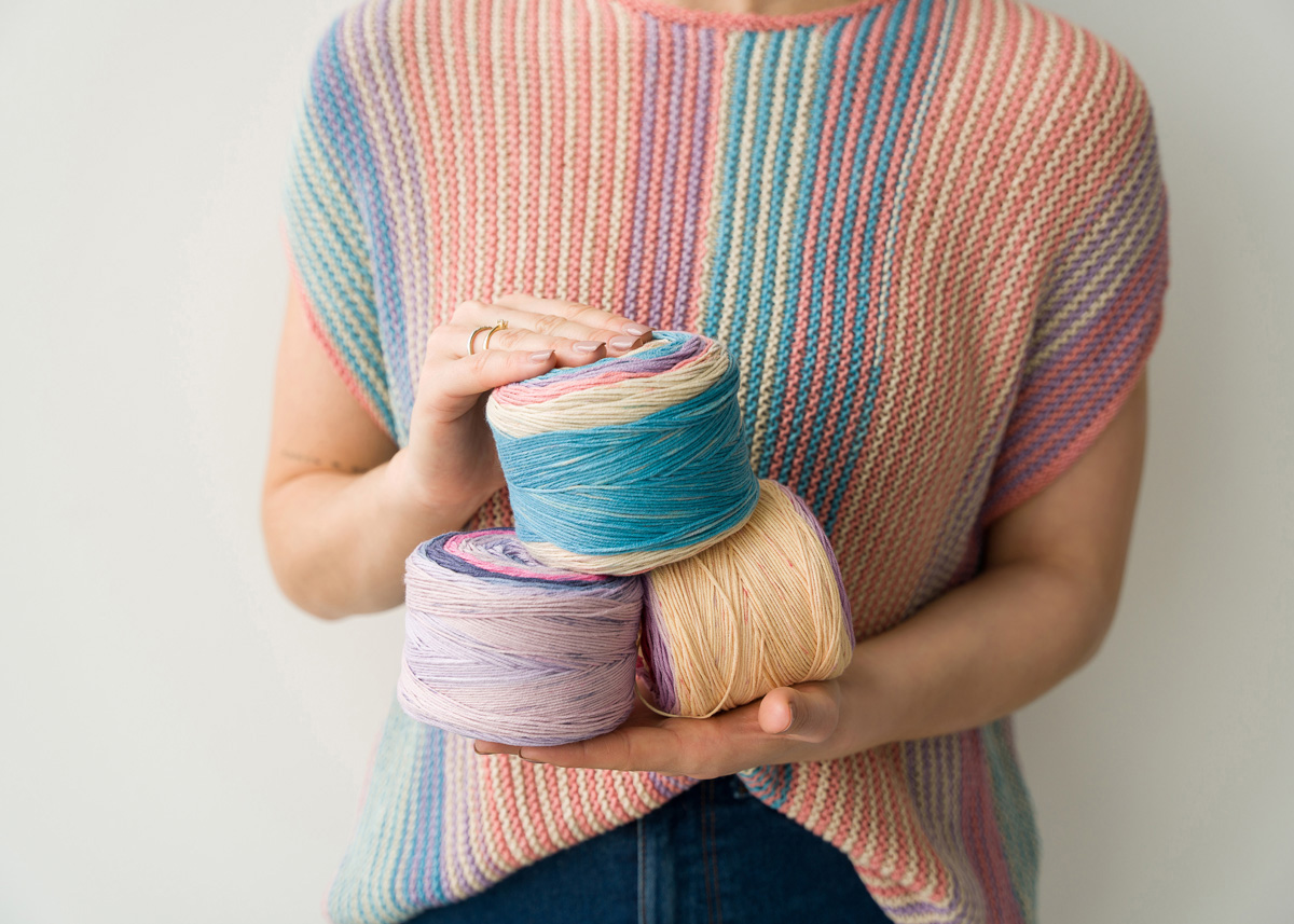 Lana Grossa-kvalitet „Bamboo“ (50 % viskos (bambu), 50 % bomull, löplängd = ca 360 m/100 g): ca 300 (300 - 400 - 400) g creme/lax/violett/ljuspetrol (färg 3017); stickor nr. 4; kort rundsticka nr. 4.