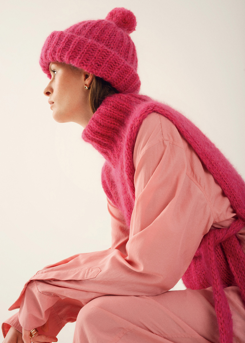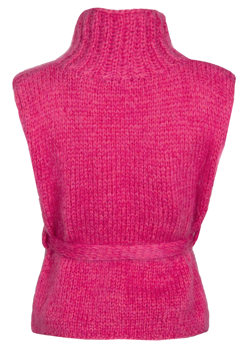 Lana Grossa-kvalitet ”Brigitte No. 2” (47 % alpaka, 45 % bomuld, 8 % ren ny uld, løbelængde = ca. 140 m / 50 gr.): ca. 200(200-250) gr pink (fv 19), og Lana Grossa-kvalitet ”Brigitte No. 3” (40 % mohair, 37 % ren ny uld, 23 % polyamid, løbelængde = ca. 100 m / 25 gr.): ca. 100(100- 125) gr pink (fv 28), strikkepinde nr. 7, strømpepinde nr. 7.