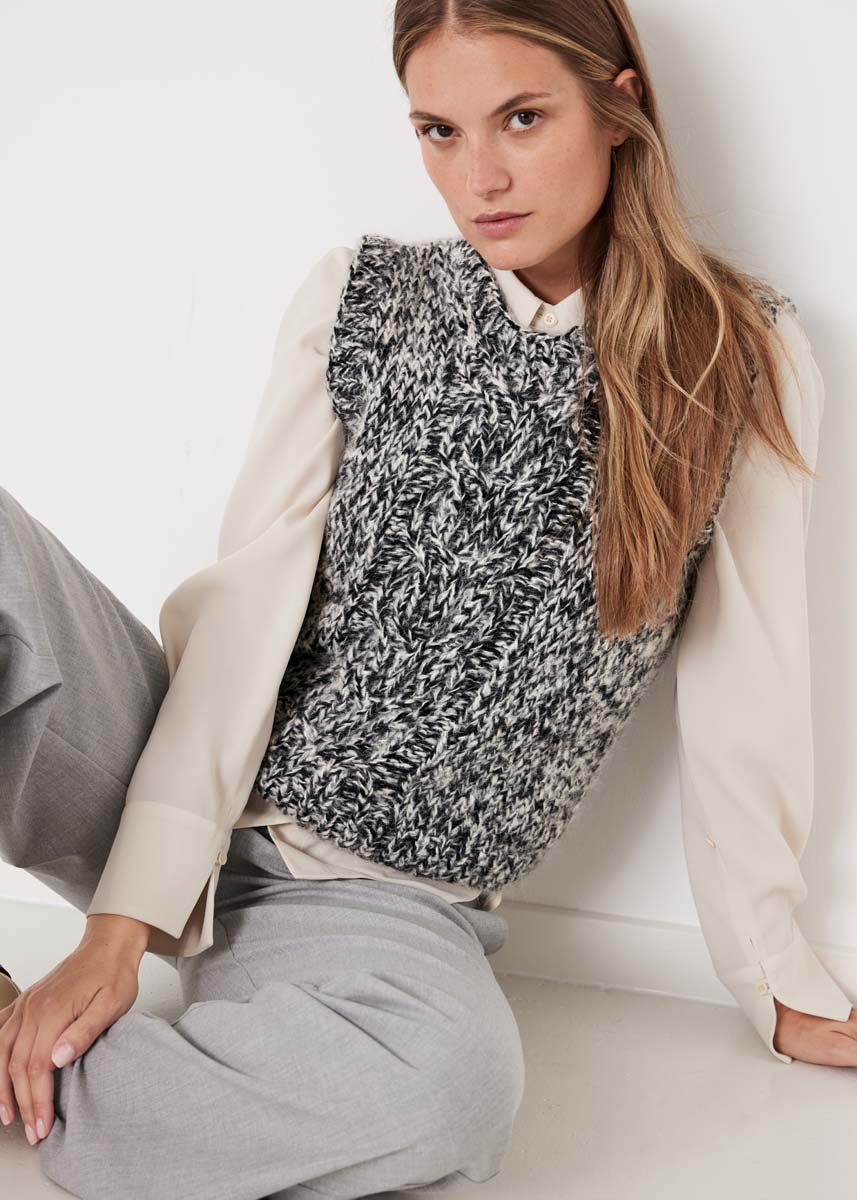 Lana Grossa Brigitte No. 2 (47% alpakka (baby), 45% bomull, 8% ny ull (merino), løpelengde 140 m/50 g), 150 (150 - 200) g i svart (farge 36) og Lana Grossa Mohair Moda (70% mohair (kid mohair), 20% ren ny ull (merino superfin), 10% polyamid, løpelengde 140 m/50 g), 150 (150 - 200) g i råhvit (farge 18); strikkepinner nr. 6 og nr. 8; 1 rundpinne nr. 6, 40 cm lang; 1 hjelpepinne.