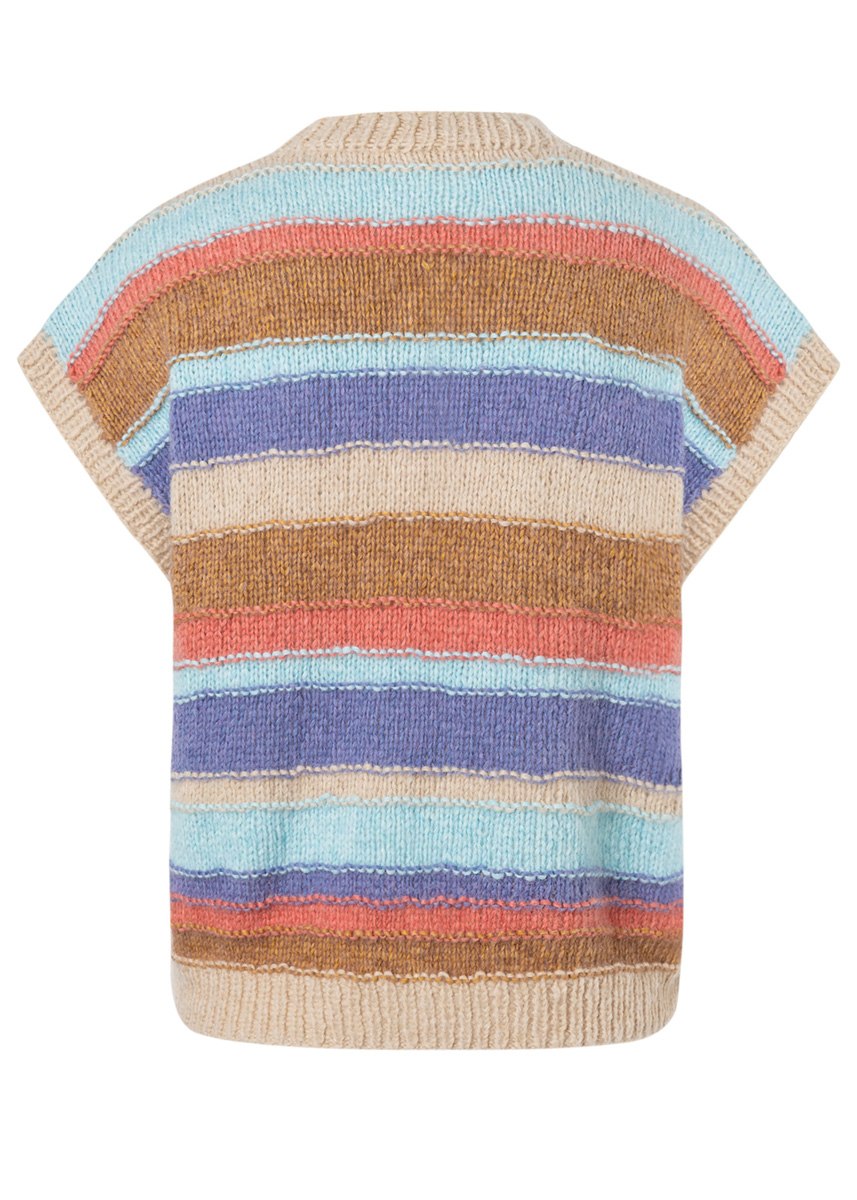Lana Grossa „Brigitte No. 2“ (47% alpacka (baby), 45% bomull, 8% ren ny ull (merino), löplängd 140 m/50 g), 100 (150 – 150) g ljusbeige (färg 47), 50 (100 – 100) g lax (färg 46), 50 (100 – 100) g isblå (färg 51), 50 (100 – 100) g lila (färg 52) och 50 (100 – 100) g sandgul (färg 37); stickor nr. 4 och 5, 1 rundsticka nr. 4, 40 cm lång.