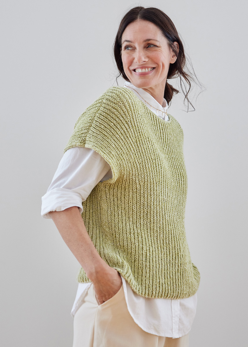 Lana Grossa-kvalitet ”Cara” (57 % (baby) alpaka, 33 % bomuld, 10 % ren ny uld (merino), løbelængde = ca. 120 m / 50 gr.): ca. 350(400-450) gr lime (fv 13), strikkepinde nr. 4½, rundpind nr. 4, 40 cm.