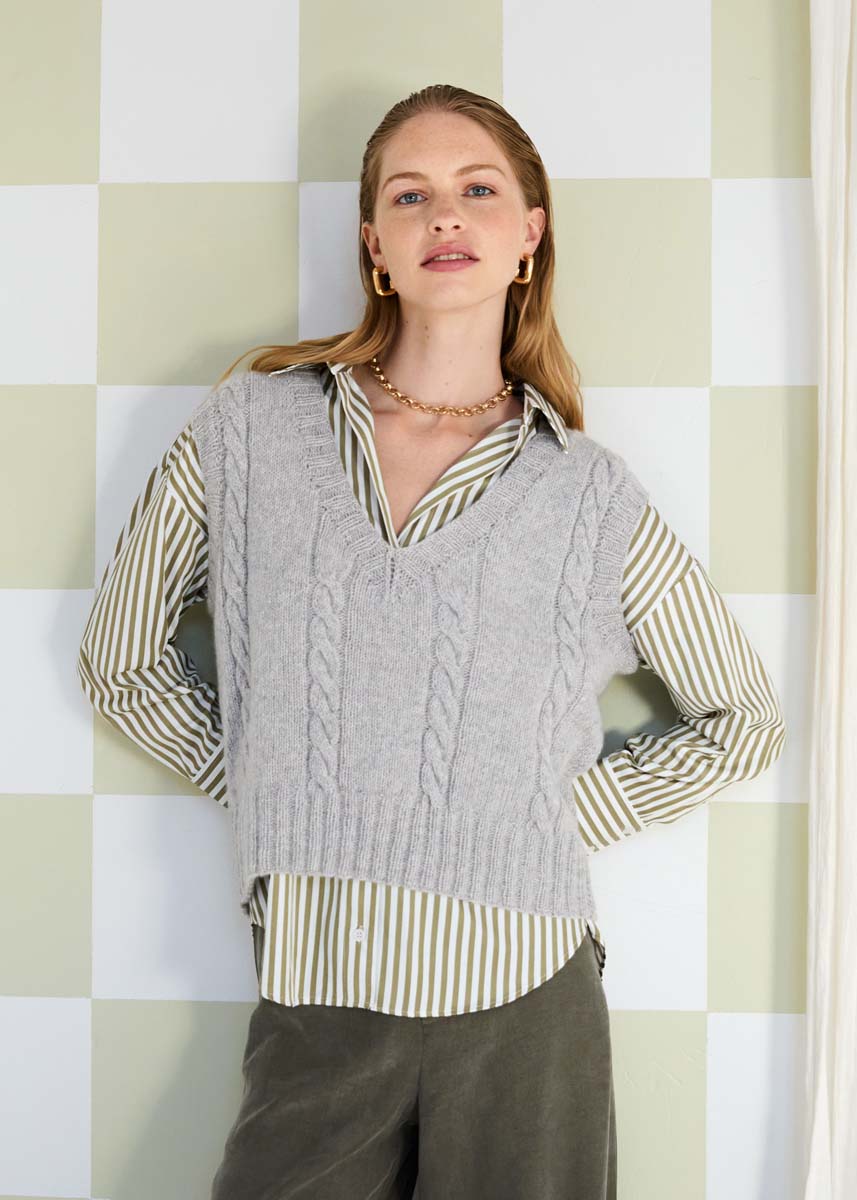 Lana Grossa Cashmere Pure (100% kashmir, löplängd 115 m/25 g), 200 (225 – 250 – 300) g ljusgrau (färg. 5); stickor nr. 3,5 och 4,5, 1 rundsticka nr. 3,5, 40 cm lång och 1 flätsticka.