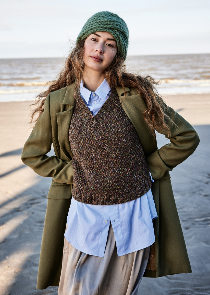 Lana Grossa-kvalitet ”Cool Merino Print” (90 % ren ny (merino), 10 % polyamid, løbelængde = ca. 150 m / 50 gr.): 200g (250g - 250g) grøn/brun/brombær/fuchsia/aubergine (fv 102), strikkepinde nr. 5 og 6, en kort rund-pind nr. 5.