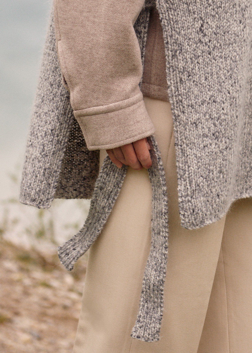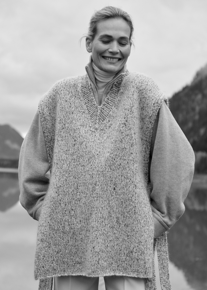 Lana Grossa Cool Merino (90% ren ny ull (merino), 10% polyamid, löplängd 150 m/50 g), 350 (400 – 400) g råvit/ mörk grå/ljus grå (färg 107) och Lana Grossa Silkhair (70% mohair, 30% siden, löplängd 210 m/25 g), 125 (150 – 150) g pärlvit (färg 58); stickor nr. 5 och 7, 1 rundsticka nr. 5, 40 cm lång.