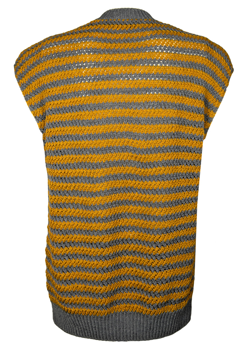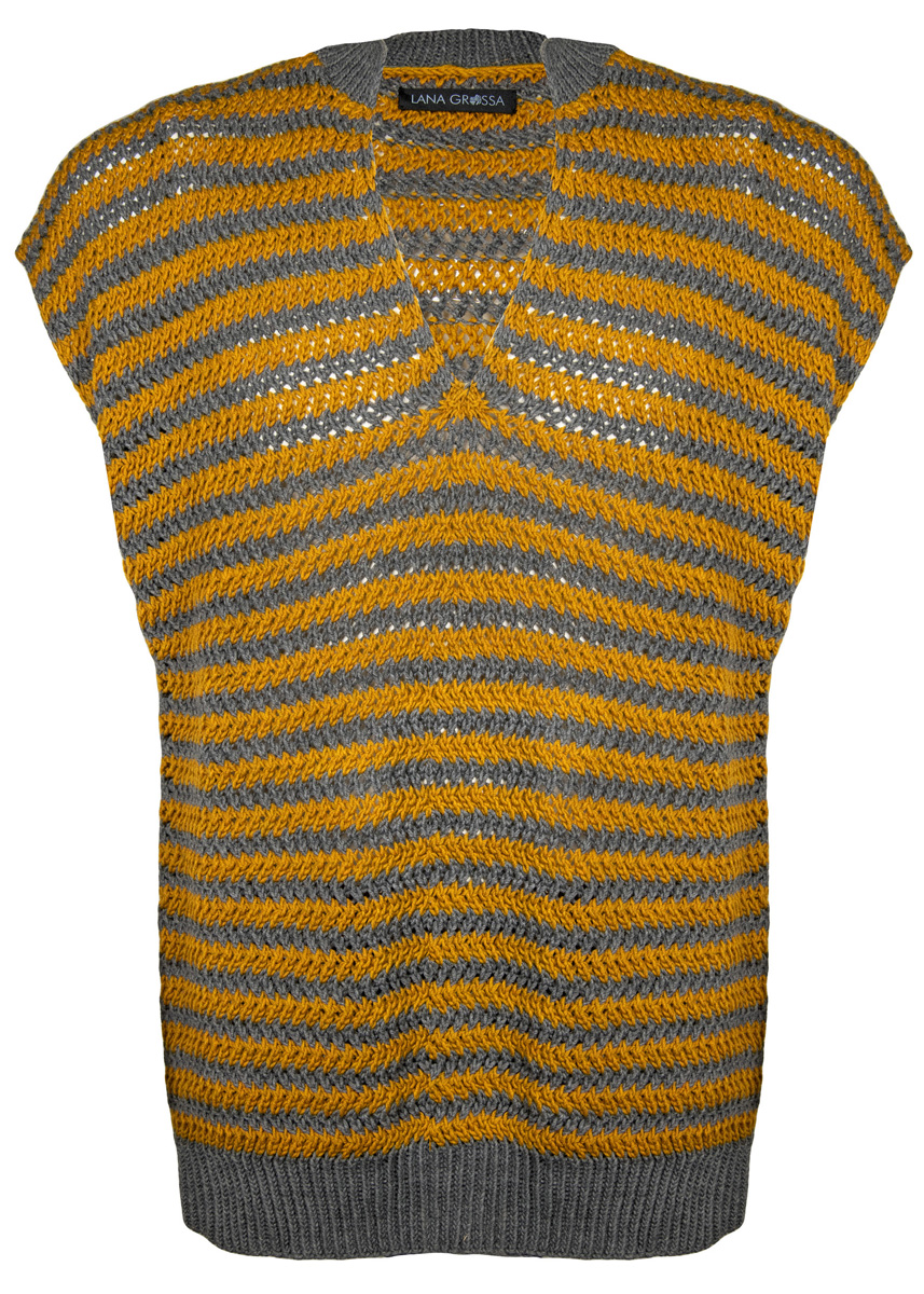 Lana Grossa Cool Wool Big (100% ren ny ull, löplängd 120 m/50 g), 300 (350 – 400) g khaki (färg 985) och Lana Grossa Cool Wool Big mélange (100% ren ny ull merino extrafine Gots, löplängd 120 m/50 g), 200 (250 – 300) g bärnsten melerat (färg 214); stickor nr. 4, 2 maskmarkörer.