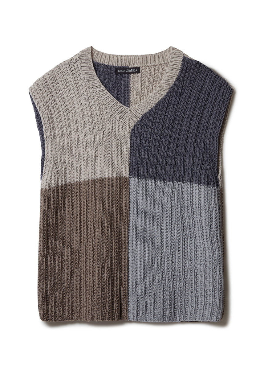 Lana Grossa Cool Wool Big (100% ren ny ull (Merino exrafein), löplängd 120 m/50 g), 150 (200 – 200) g mellangrå (färg 928), 150 (200 – 200) g vitgrå (färg 1002), 150 (200 – 200) g taupe (färg 686) och 100 (150 – 150) g stålgrå (färg 981); stickor nr. 4,5 och 1 rundsticka nr. 4, 40 cm lång.