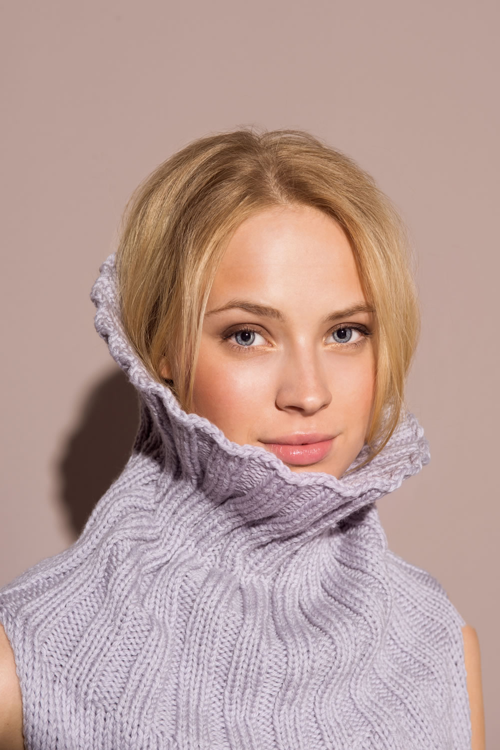 Lana Grossa-kvalitet ”Cool Wool Cashmere” (90 % ren ny uld, 10 % cashmere, løbelængde = ca. 160 m / 50 gr.): ca. 550(600-650) gr. lys lilla (fv. 1), strikkepinde nr. 8 og 9, rundpind nr. 8.
