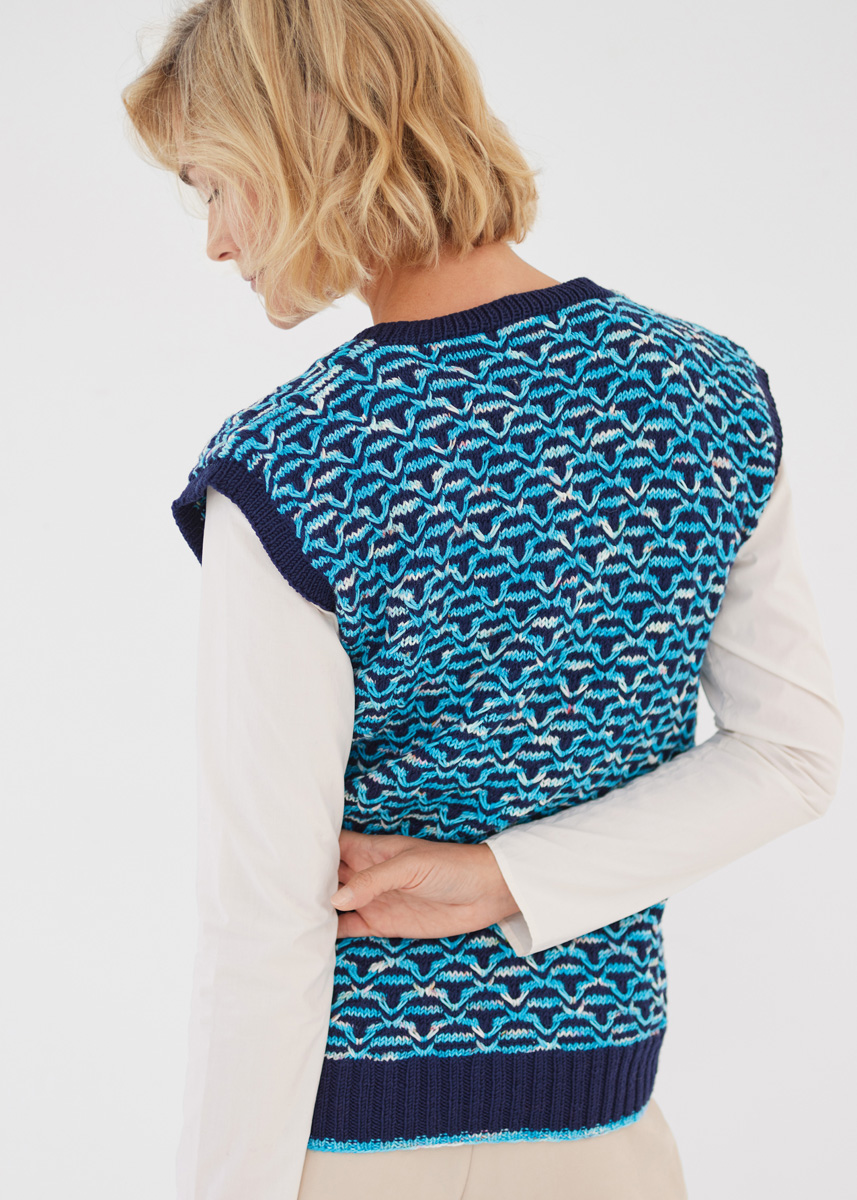 Lana Grossa-kvalitet ”Cool Wool” (100 % ren ny uld, løbelængde = ca. 160 m / 50 gr.): 250(300-350) gr natblå (fv 414) og Lana Grossa-kvalitet ”Cool Wool handdyed” (100 % ren ny uld, løbelængde = ca. 320 m / 100 gr.): 200(300-300) gr kerala (fv 110), strikkepinde nr. 2½ og 3½, rundpind nr. 2½, 40 cm, 1 snoningspind.