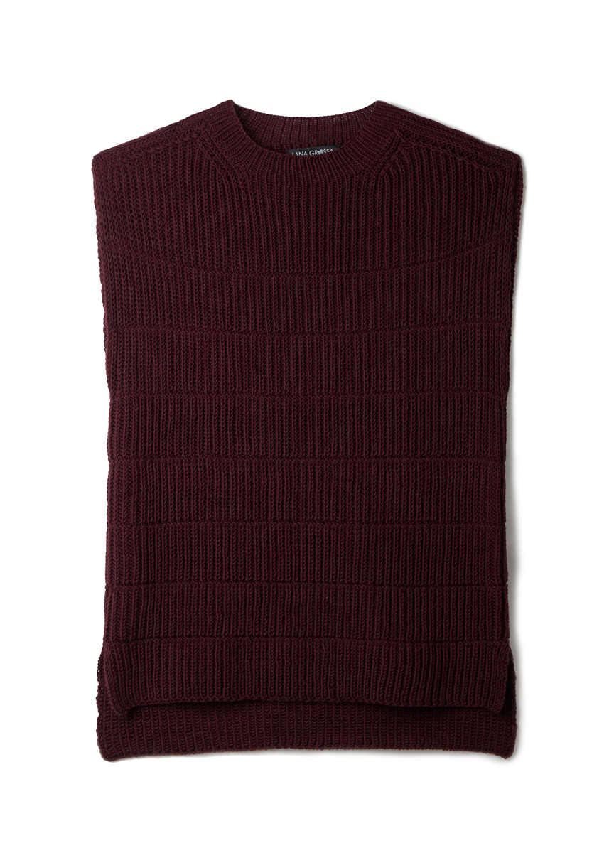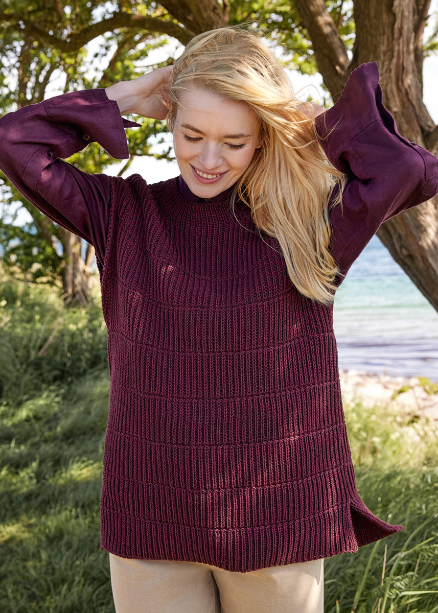 Lana Grossa Cool Wool Mélange (100 % ren ny ull (merino), LL = ca. 160 m/50 g), 500 (550 – 600 – 650) g svartrød melert (frg 1404) Pinner: Nr. 4, rundpinne (40 cm) nr. 3,5, fire hjelpepinner for å legge m til side Tilbehør: 1 maskemarkør (MM)