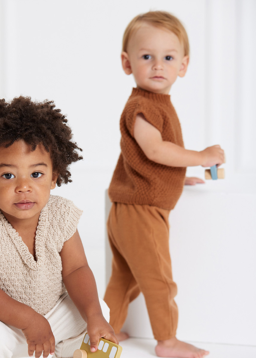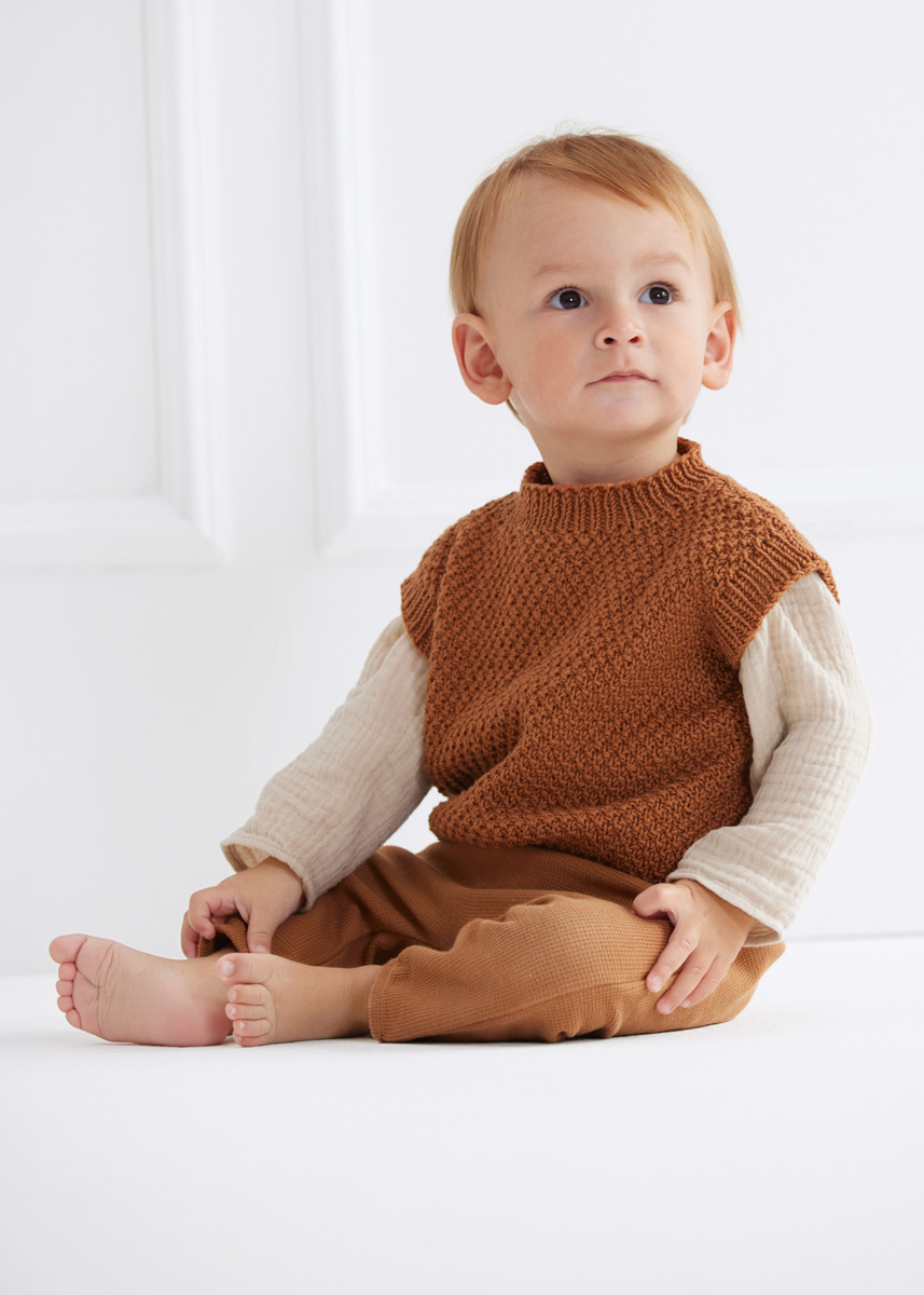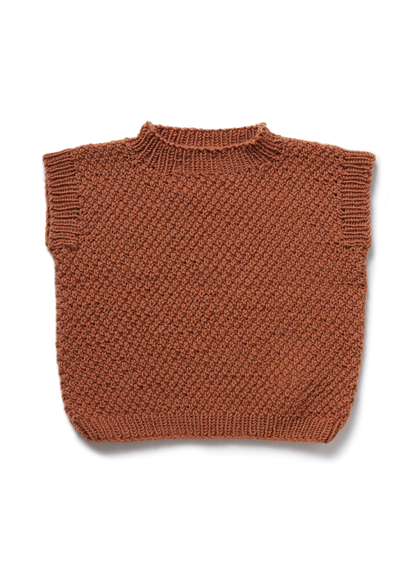 Lana Grossa-kvalitet ”Cool Wool” 100 % ren ny uld (ekstrafin merino), løbelængde = ca. 160 m / 50 gr.): 100 (100/100/150) gr karamel (fv 2054), rundpind nr. 3½, strømpepinde nr. 3½