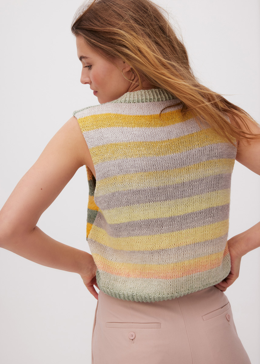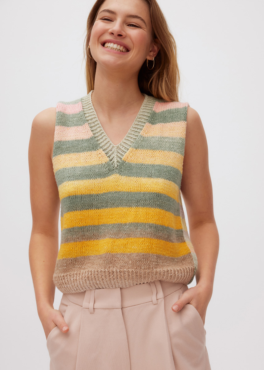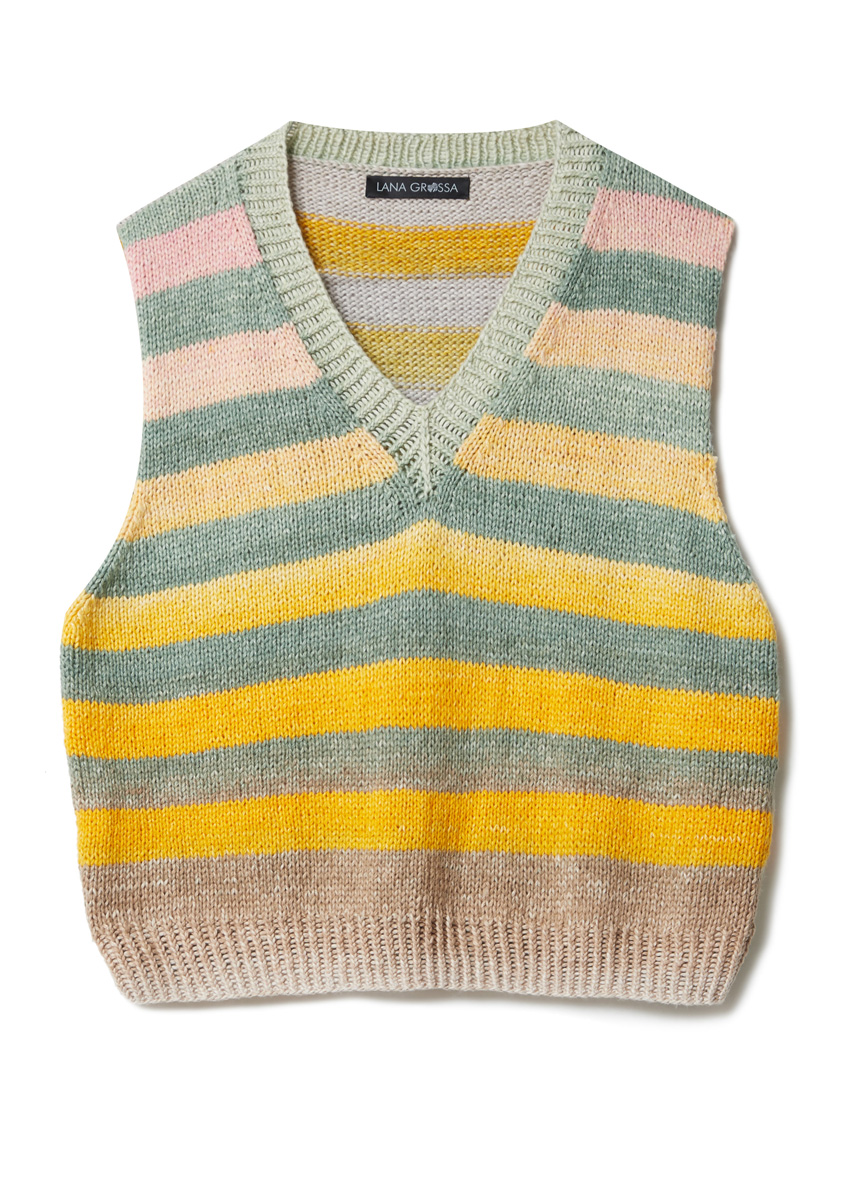Lana Grossa-kvalitet „Cotonella“ (100% bomull (Pima), löplängd = ca 280 m/100 g): 2 (2 - 2 - 3) nystan = ca 200 (200 - 200 - 300) g gråbeige/minttürkis/natur/musgrå/stengrå (färg 10) och 1 (1 - 2 - 2) nystan = ca 100 (100 - 200 - 200) g ljusgrå/narciss/gul/rosabeige/pink/lax (färg 3); stickor nr. 3,5 och nr. 4; 1 kort rundsticka nr. 3,5.