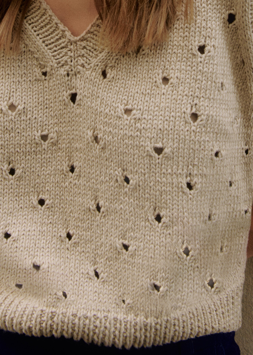 Lana Grossa-kvalitet „Dodici“ (65 % bomull, 25 % viskos, 10 % lin, löplängd = ca 110 m/50 g): ca 250 (300 - 350 - 400) g beige (färg 18); stickor nr. 3 och nr. 5; 1 kort rundsticka nr. 3.