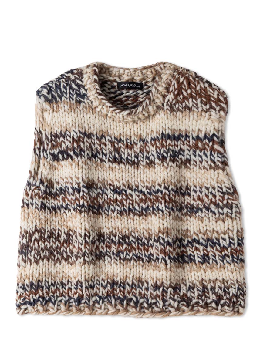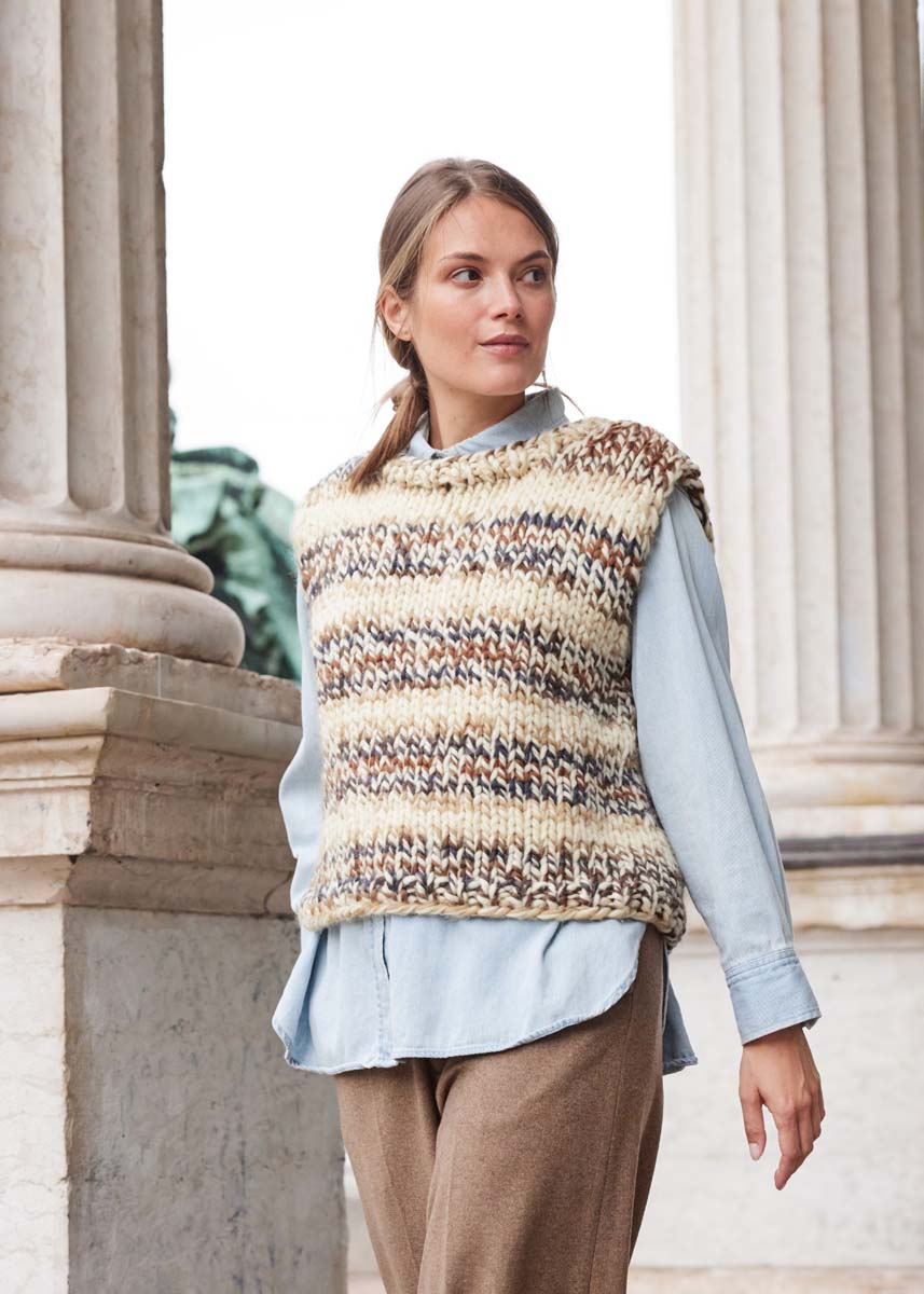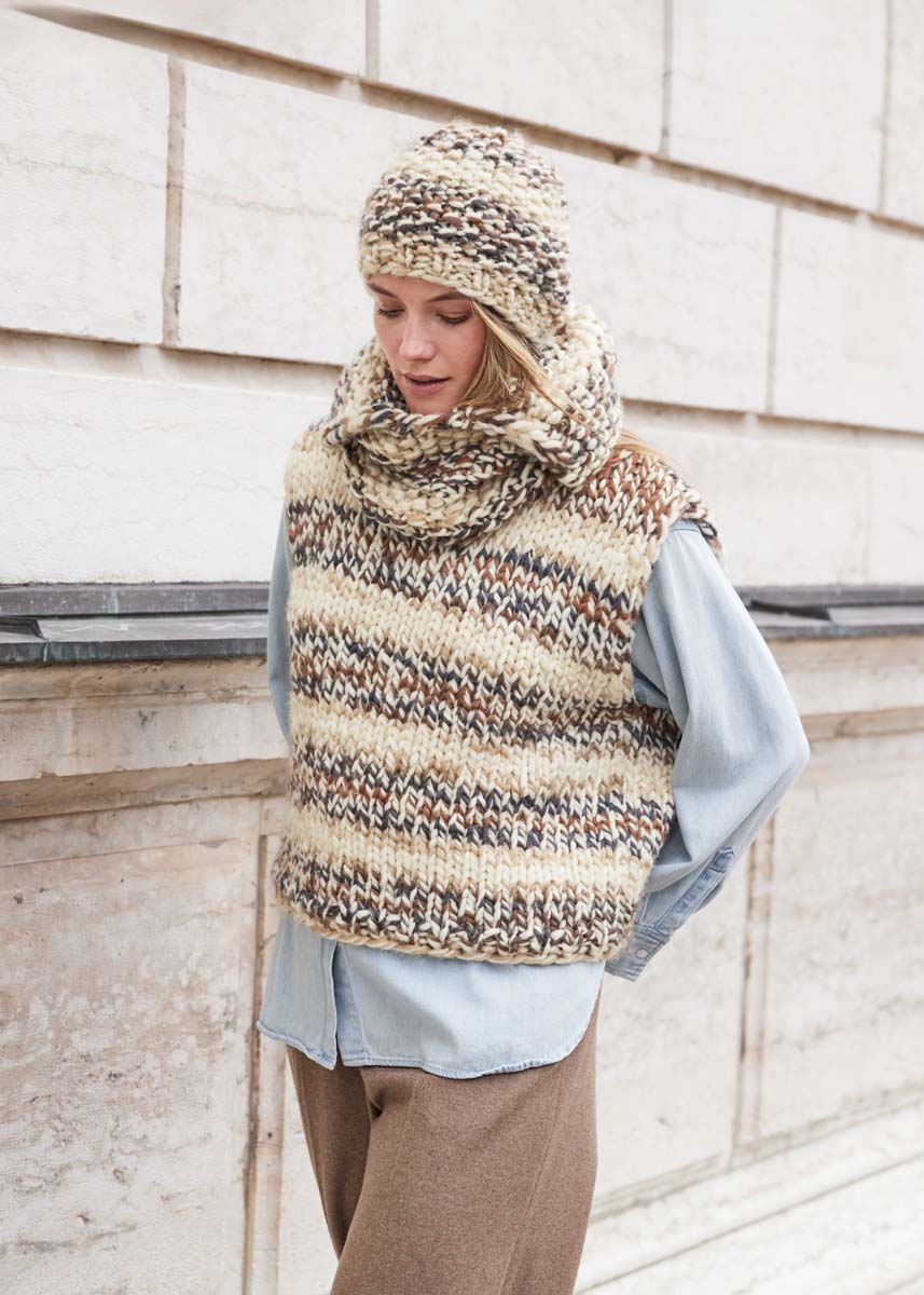 Lana Grossa Dolce (100% ren ny ull (merino basolan), løpelengde = ca. 50 m/100 g), 500 (600 - 600) g i råhvit/beige/ nougat/grå (farge 1); strikkepinne nr. 12 og 5 settpinner nr. 12; eine hjelpepinne til hvilende m.