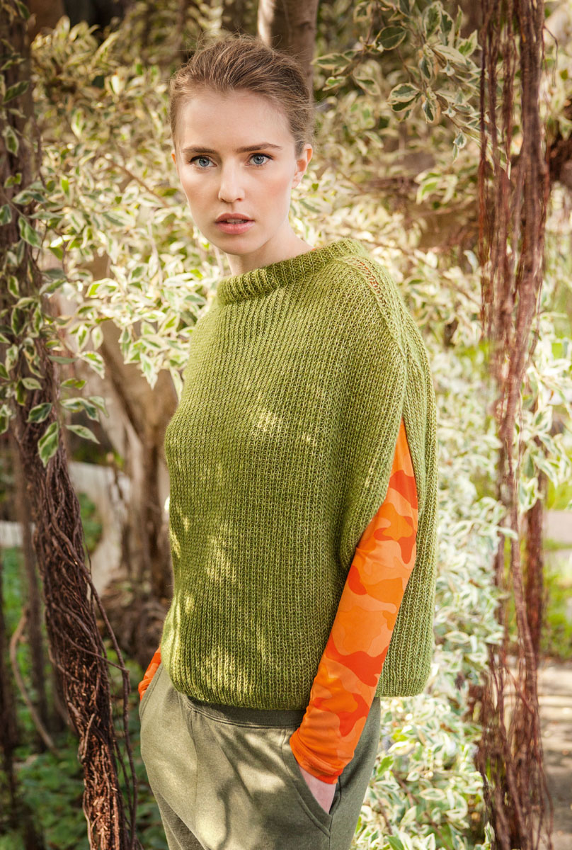 Lana Grossa-kvalitet ”Ecopuno” (72 % bomuld, 17 % ren ny merino, 11 % baby alpaka, løbelængde = ca. 215 m / 50 gr.): ca. 300(350-400) gr æblegrøn (fv 2), strikkepinde nr. 4, rundpind nr. 4, 40 cm