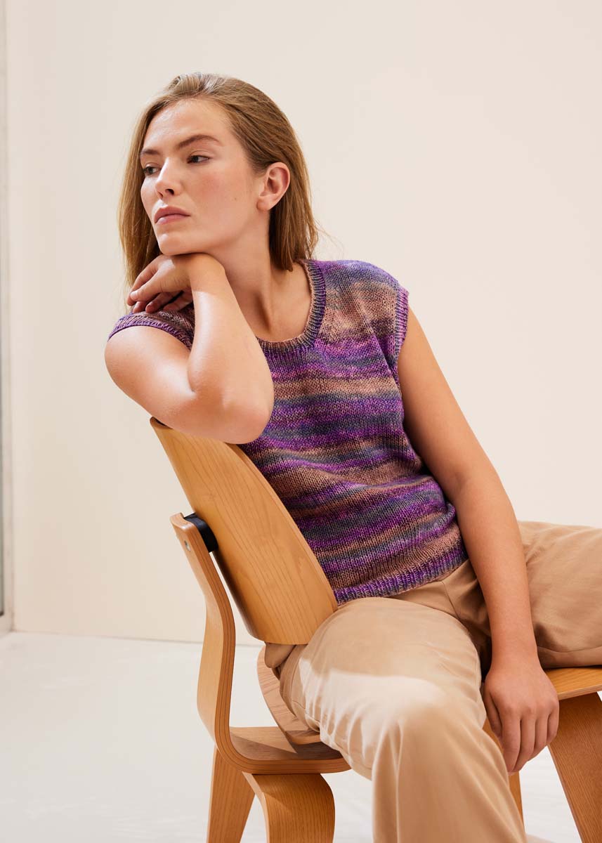 Lana Grossa-kvalitet „Gianna“ (80 % bomull (bio), 15 % ren ny ull (merino), 5 % kashmir, löplängd = ca 180 m/50 g): ca 200 (200 - 250 - 300) g violett/burgund/grå/syren/gråblå/ kamel (färg 3); stickor nr. 4 och 4,5; 1 kort rundsticka nr. 4.