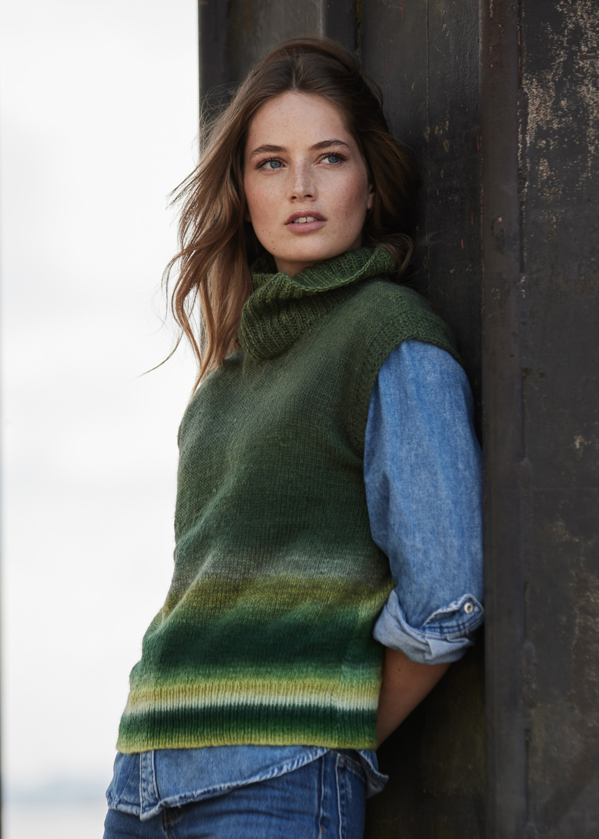 Lana Grossa-kvalitet „Gomitolo Finito“ (100 % ren ny ull (Merino), löplängd = ca 520 m/200 g): 400 (400 - 400) g Mossgrön/svartgrön/oliv/grågrön/pistasch (färg 564); stickor nr. 3,5 och 4; kort rundsticka nr. 3,5.