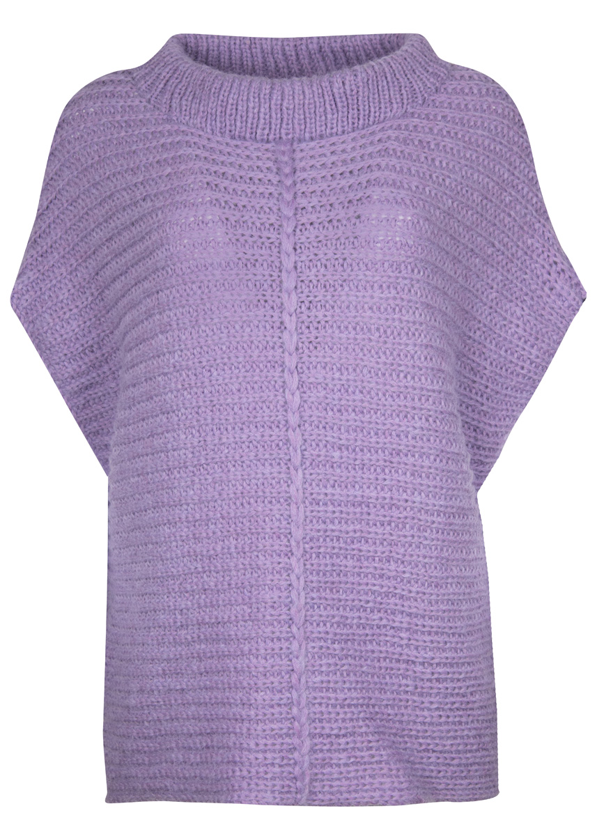 Lana Grossa-kvalitet „Brigitte No. 2” (47 % (baby) alpakka, 45 % bomull, 8 % ren ny ull (merino), løpelengde = ca. 140 m/50 g): ca. 350 (400 – 450) g lilla (farge 26); rundpinner nr. 5,5 og 6, 80 cm lang, 1 rundpinne nr. 5, 60 cm lang, 1 stor ullnål.