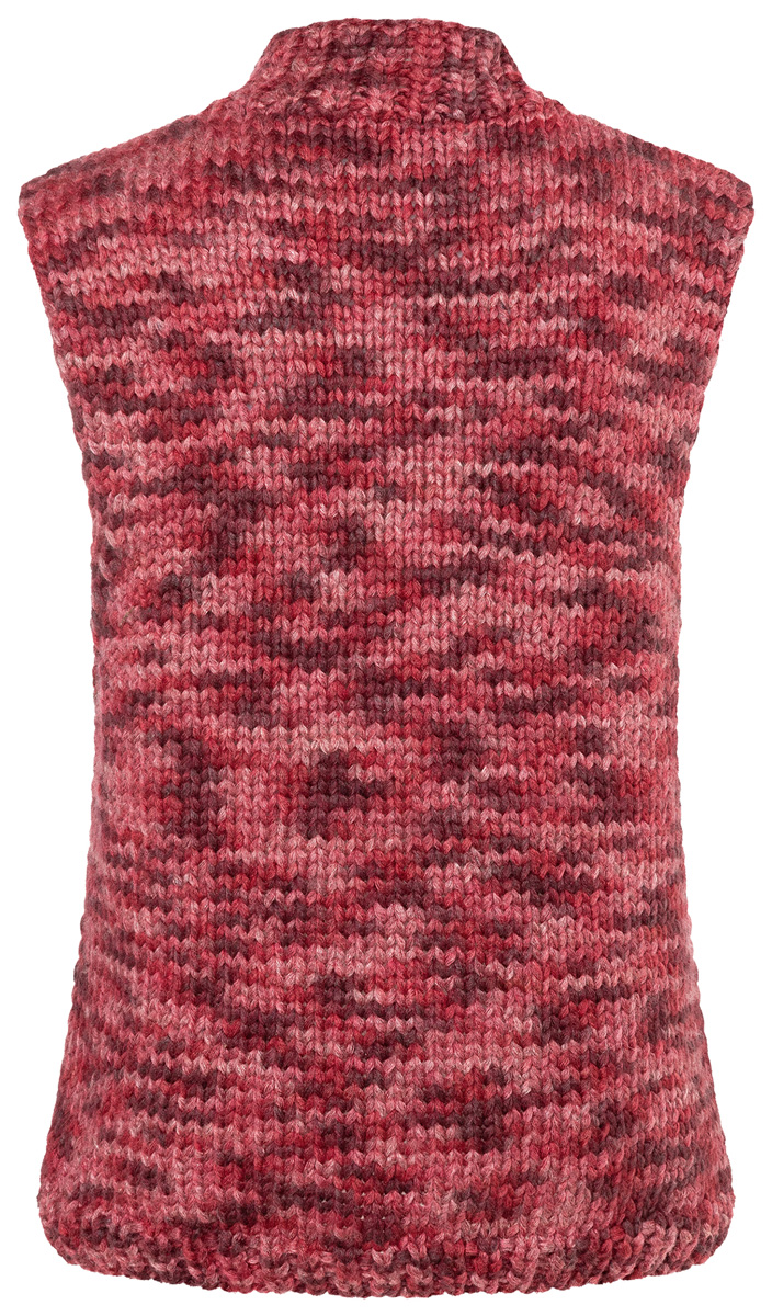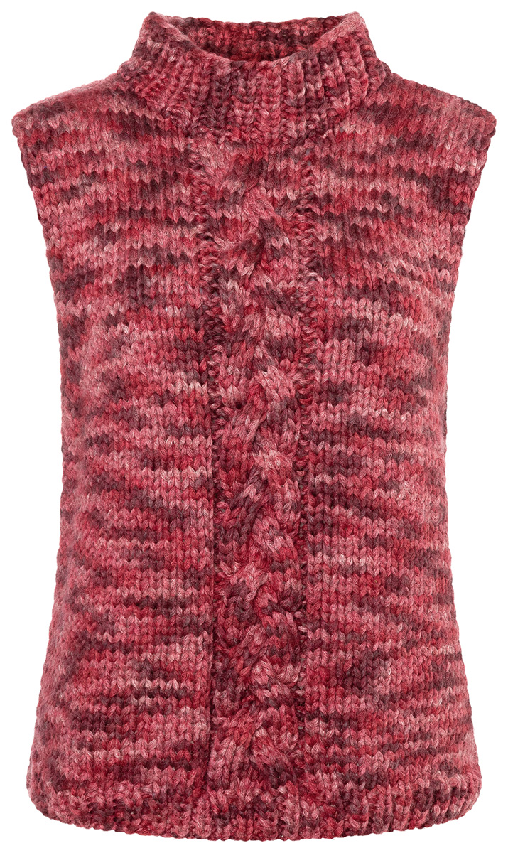 Lana Grossa Inizio (54% ren ny ull (merino), 18% modal, 16% polyamid, 12% bomull, löplängd 60 m/50 g), 350 (400 – 450) g flamingoröd/marsalaröd (färg 105); stickor nr. 10, 1 rundsticka nr. 10, 40 cm lång och 1 flätsticka.