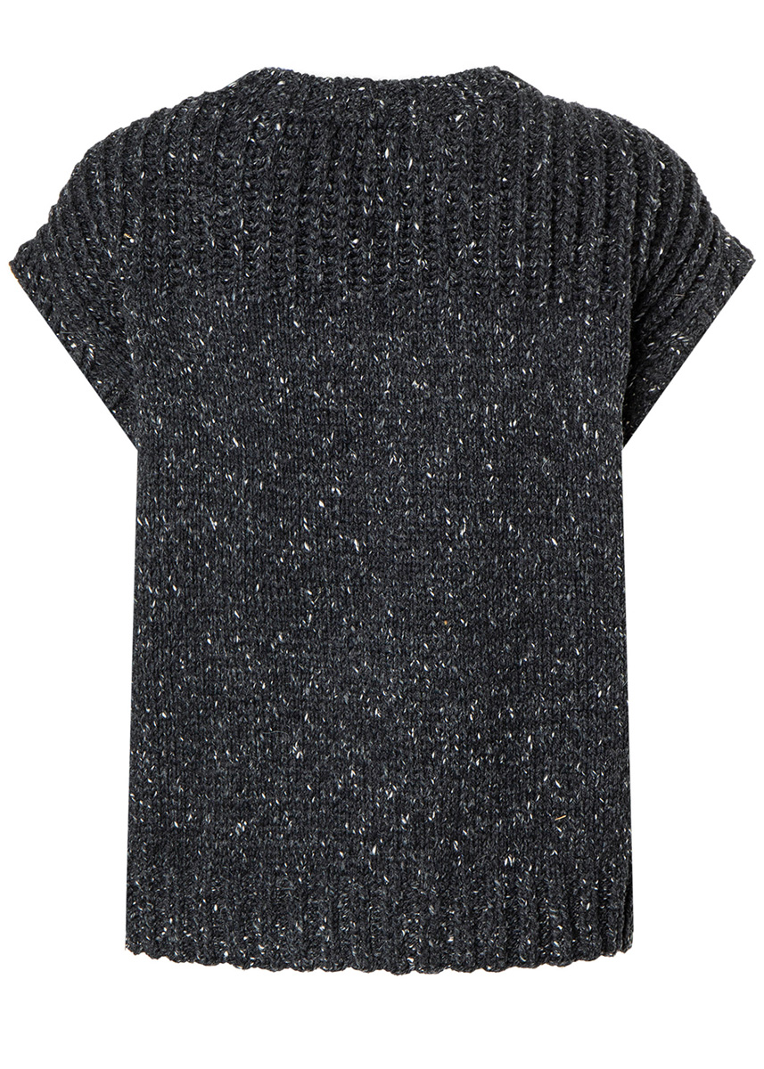 Lana Grossa Landlust Soft Tweed 90 (100% ren ny ull, Laulänge 90 m/50 g), 400 (450 – 500) g svart melerad (färg 6); stickor nr. 4,5 och 5, 1 rundsticka nr. 4,5, 40 cm lång.