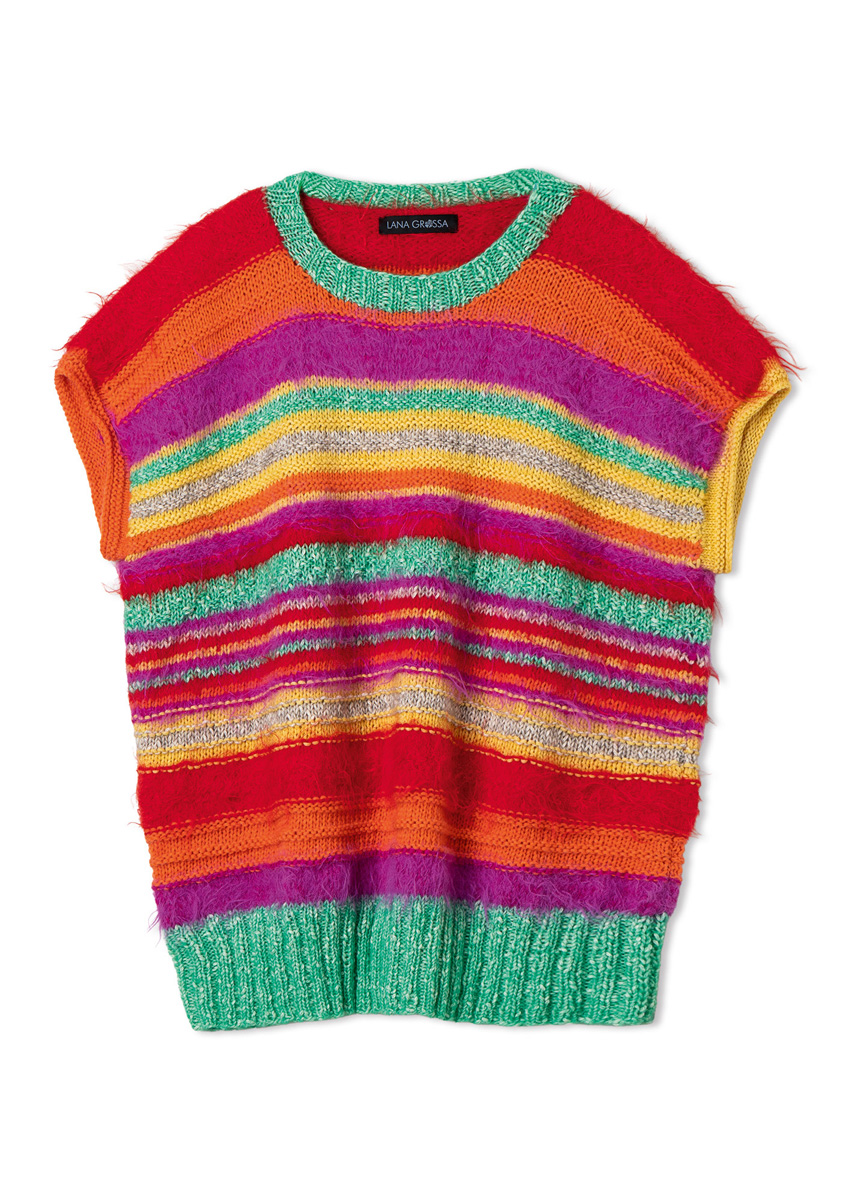 Lana Grossa-kvalitet „Basta“ (50 % ren ny ull (merino), 50 % polyamid, løpelengde = ca 100 m/50 g): ca 100 (100 - 150 - 150) g refleksrød (farge 27) og ca 100 (100 - 150 - 150) g pink (farge 10); Lana Grossa-kvalitet „Bottoni“ (53 % bomull, 24 % viskose, 23 % ren ny ull (merino extrafine), løpelengde = ca 125 m/50 g): ca 150 (150 - 150 - 200) g jade/råhvit (farge 10) og ca 50 (50 - 50 - 50) g gråbeige/creme (farge 13); Lana Grossa-kvalitet „Summer Softness“ (80 % bomull (bio), 20 % ren ny ull (merino superfine), løpelengde = ca 130 m/50 g): ca 100 (100 - 150 - 150) g gresskar (farge 6) og ca 50 (100 - 100 - 100) g gul (farge 11); pinner nr. 4 og nr. 6; 1 kort rundpinne nr. 4.