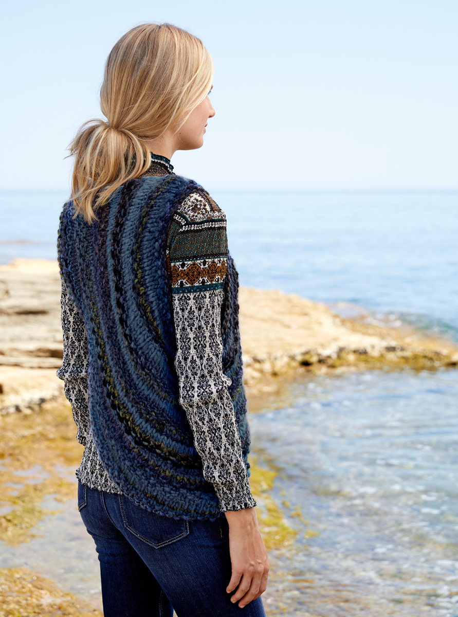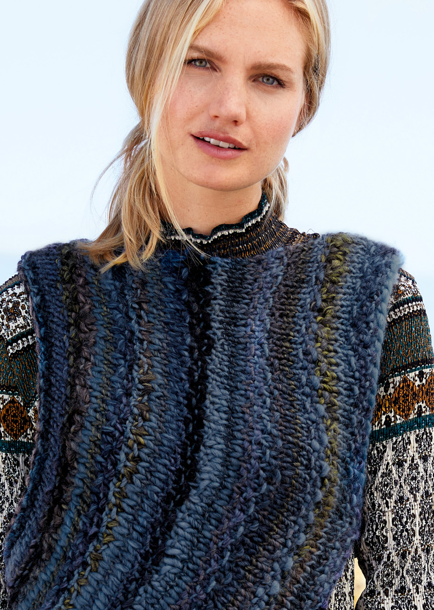 Lana Grossa Olympia Classic (53 % virginull, 47 % polyakryl, löplängd = ca. 100 m/100 g): ca. 300 (400) g gråbrun/mocka/duvblå/marine/ljus blå/jeans (färg 61); 1 rundsticka Nr. 10, 80 och 120 cm lång, 1 virknål Nr. 6; 1 duffelknapp med 2 hål (horn-spets) från Union Knopf, Art. 35579, färg 22 svartbrun, 50 mm.