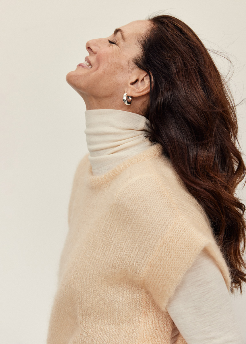 Lana Grossa Silkhair (70% mohair (superkid), 30% silke, löplängd 210 m/25 g), 125 (150 – 175) g persika (färg 195); stickor nr. 4 och 4,5 och 1 rundsticka nr. 4, 40 cm lång.
