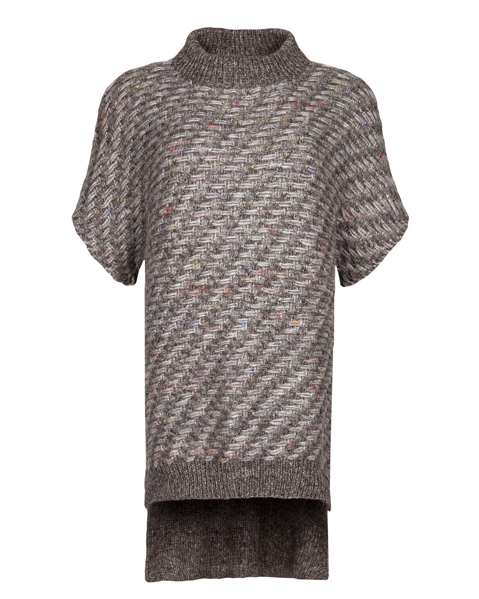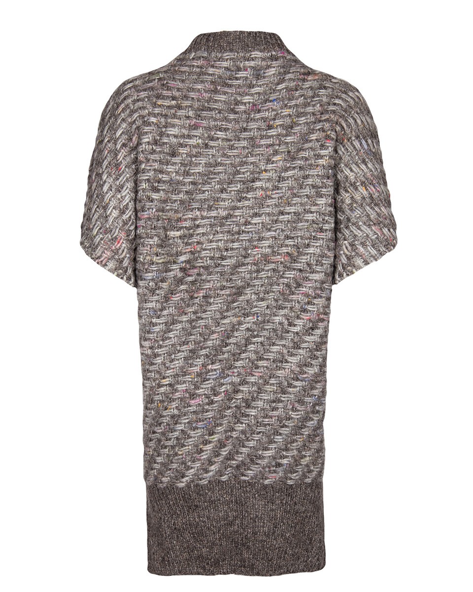Lana Grossa-kvalitet ”Smokey” (46 % virgin ull (merino), 41 % bomull, 8 % polyamid, 5 % jak, löplängd = ca. 225 m / 50 gr.): 200(250-300) gr grège/beige/mörk grå (färg 207) och Lana Grossa-kvalitet ”Lala Berlin Lovely Fine Tweed” (37 % alpacka, 35 % polyamid, 26 % virgin ull, 2 % viskos, löplängd = ca. 175 m / 50 gr.): 150(200-250) gr ljus grå (färg 105), stickor nr. 3½ och 7, rundpinne nr. 3½, 40 cm.