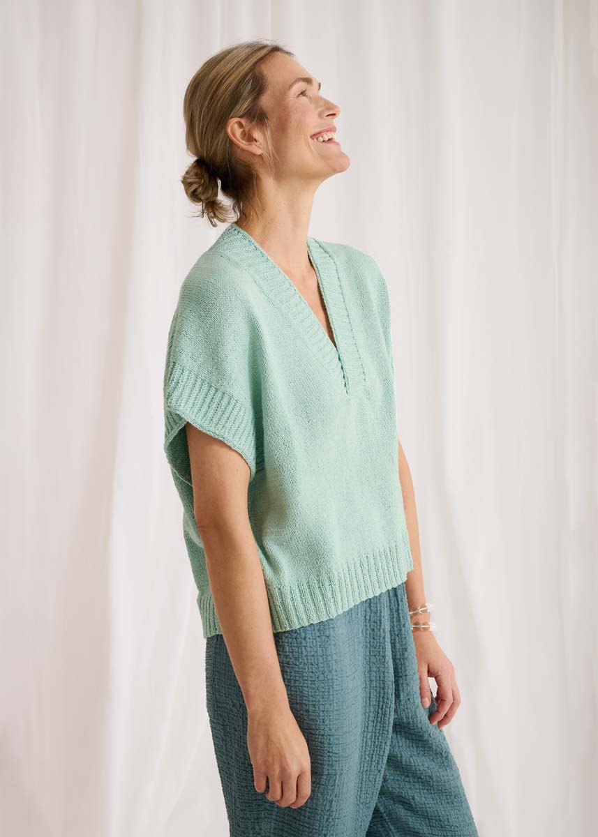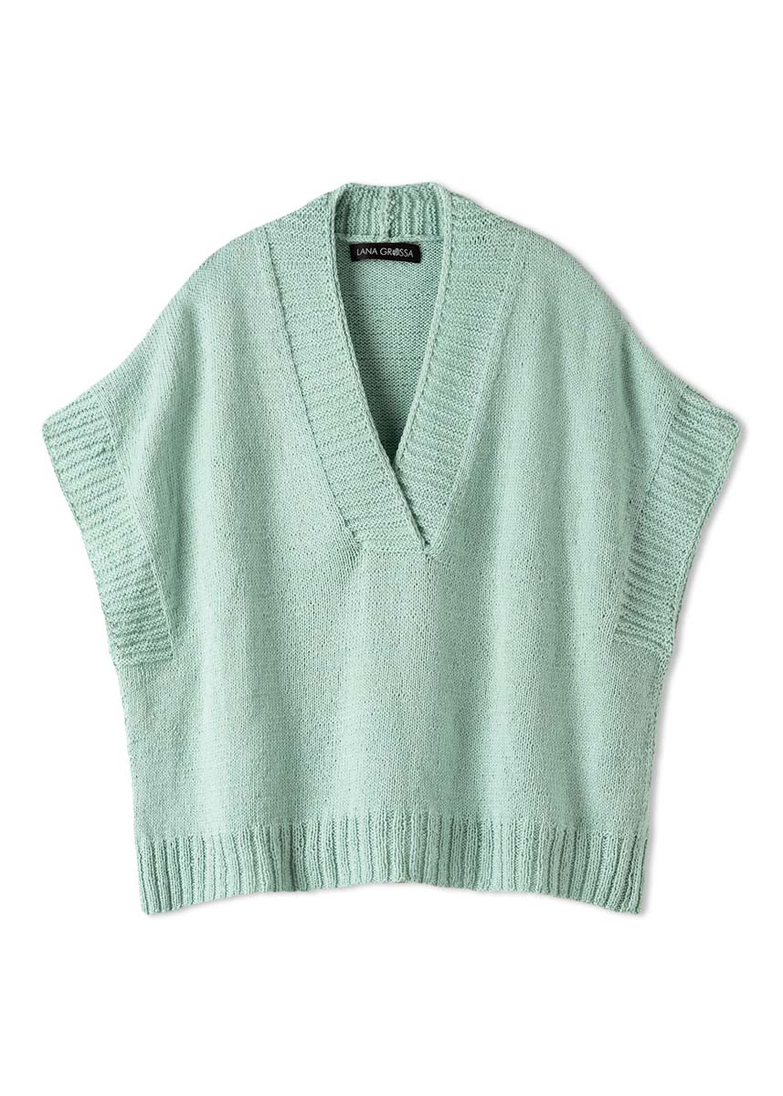 Lana Grossa Summer Cashmere (90% bomull, 10% kasjmir, løpelenge 210 m/50 g), 300 (350 – 400 – 450) g mint (farge 12); pinner nr. 2,5 og 3.