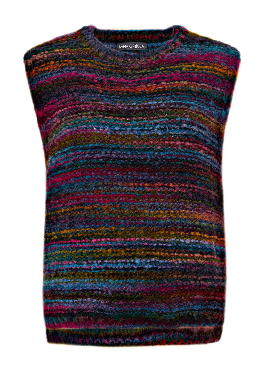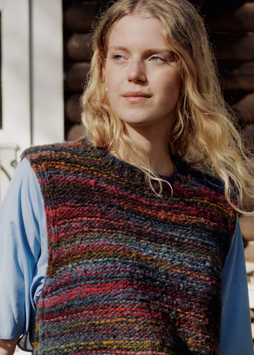 Lana Grossa-kvalitet „Twin 50 g“ (46 % (baby) alpacka, 45 % ren ny ull (merino), 9 % polyamid, löplängd 85 m/50 g): ca. 200 (250 – 300) g gråblå/pink/oliv/mörk grön/lila/ockra/grågrön/petrol (färg 201); stickor nr. 7, 1 rundsticka nr. 7, 40 cm lång.