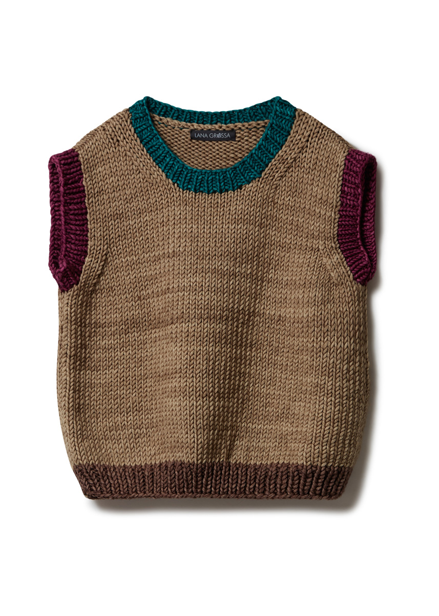 Lana Grossa Vintage Superchunky (100% ren ny ull (merino), löplängd 80 m/100 g), 400 (500 – 500) g khakibeige (färg 508), 100 g mörkbrun (färg 510), 100 g opalgrön (färg 506) och 100 g bordeaux (färg 502); stickor nr. 7 och 8, samt 1 rundsticka nr. 7, 40 cm lång.
