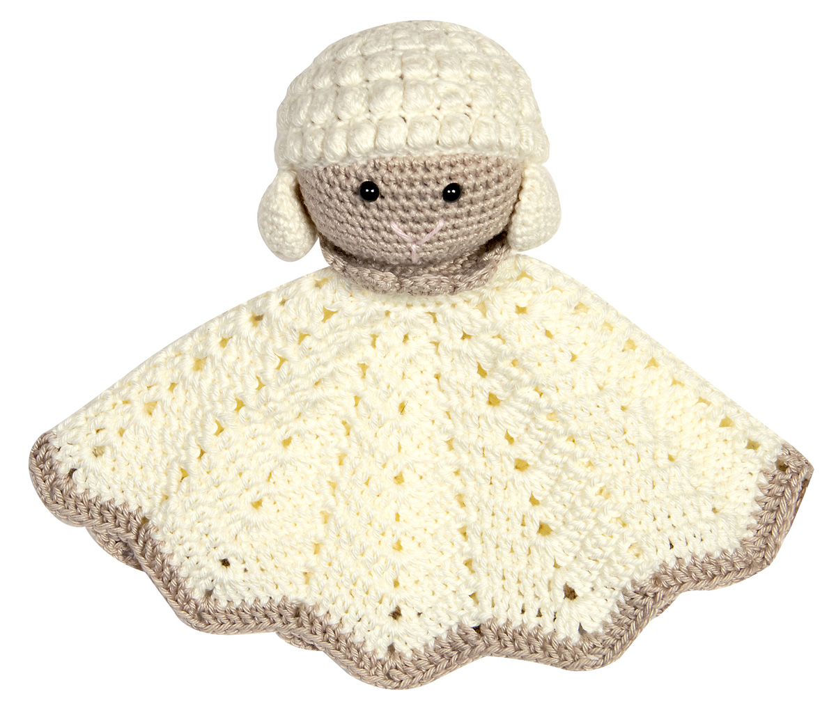 Lana Grossa-kvalitet ”Cotone” (100 % bomuld, løbelængde = ca. 125 m / 50 gr.): 50 gr råhvid (fv 28), 50 gr beige (fv 26) og 50 gr rosa (fv 1), hæklenål nr. 3, fyldvat, 2 øjne 5 mm Ø.