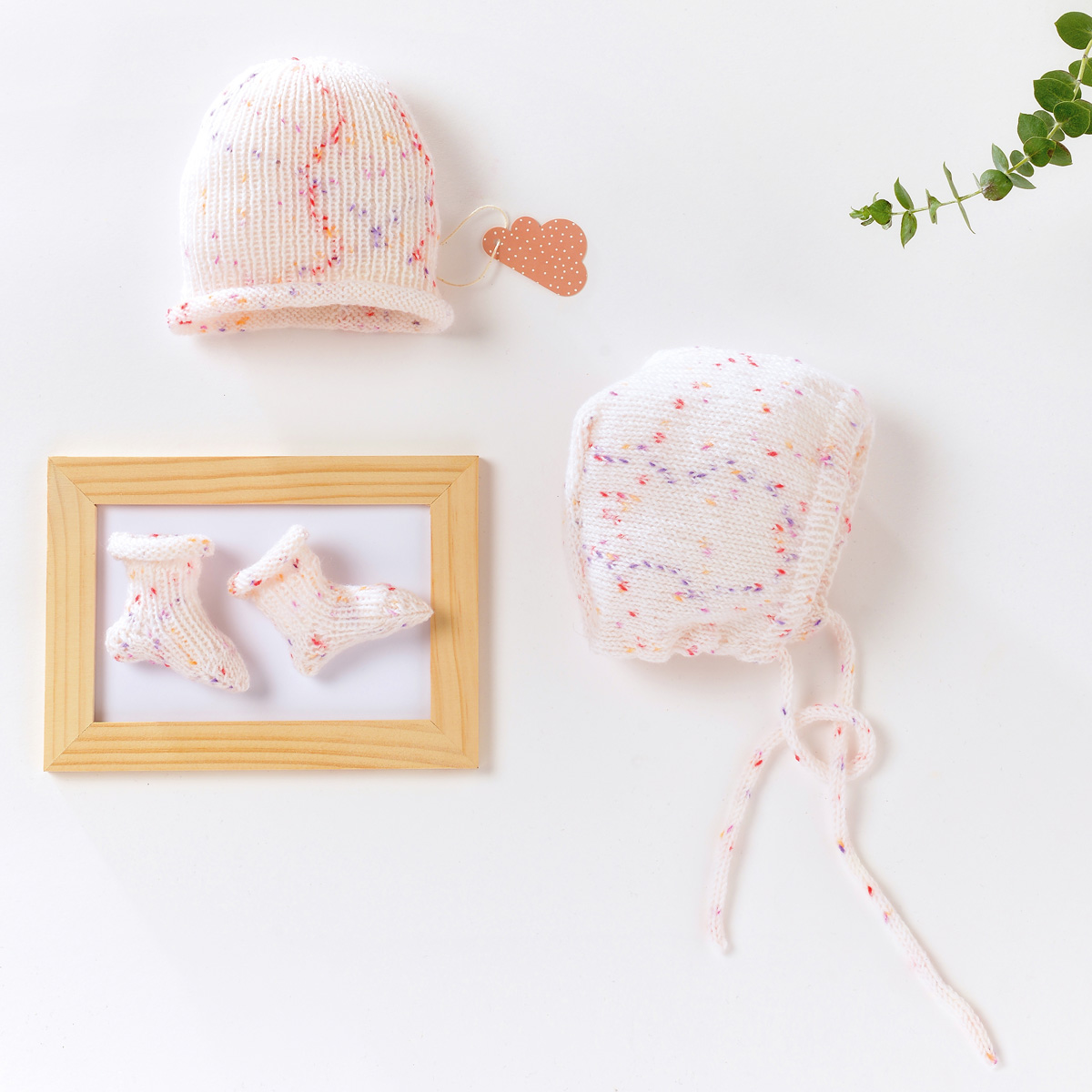 Lana Grossa-kvalitet ”Cool Wool Baby Print Punto” (100 % ren ny uld, løbelængde = ca. 220 m / 50 gr.): 50 gr hvid/hindbær/ orange/lilla/violet (fv 352), strikkepinde nr. 3