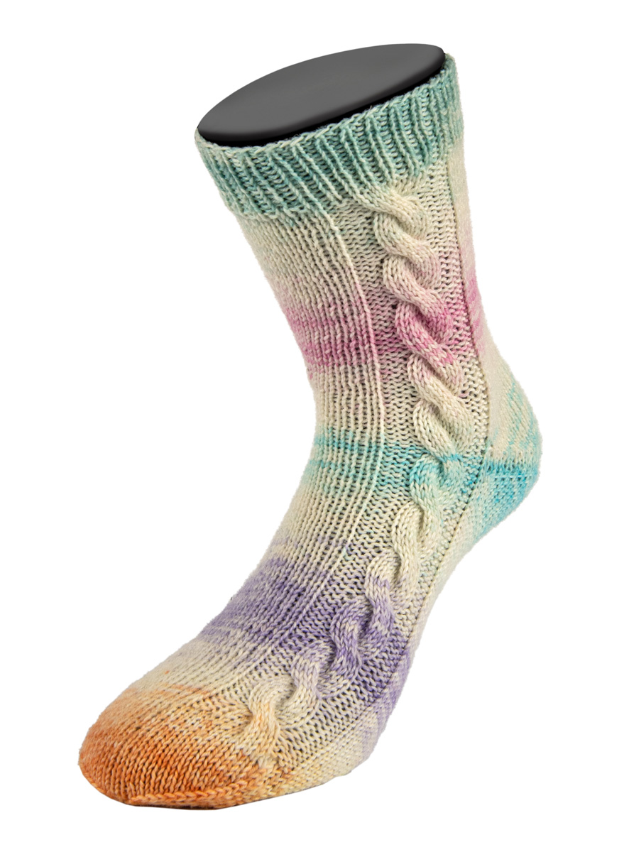 Lana Grossa-kvalitet „Meilenweit 100 g Merino Rainbow hand-dyed“ (80% ren ny ull (merino), 20% polyamid, löplängd 420 m/100 g), 100 g Birla (färg 7003) strumpstickor nr. 3 och 1 flätsticka.