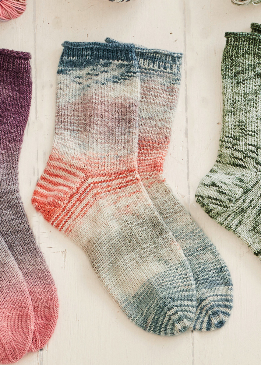 Strumpstickor nr. 3 Variant B: Lana Grossa Meilenweit 100g Merino Rainbow hand-dyed 80% ren ny ull (merino), 20% polyamid, Löplängd 420 m/100 g ■ 100 g blågrå/ljus beige/ljus grå/nattblå/råvit/tomat/terrakotta (färg 7003)