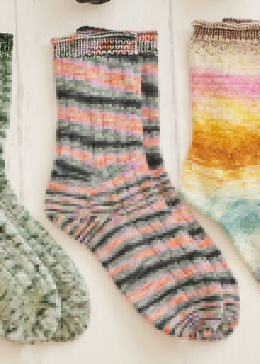 Strumpstickor nr. 3: Variant B: Lana Grossa Meilenweit 100g Merino Shadow handdyed 80% ren ny ull (merino), 20% polyamid, Löplängd 420 m/100 g ■ 100 g ljus röd/vit/syren/grågrön/anthracit (färg 618)