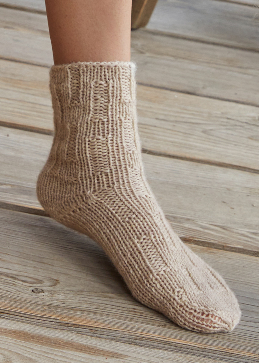 Lana Grossa Meilenweit 8-ply 150g 80% ren ny ull, 20% polyamid, Löplängd 315 m/150 g ■ 150 g beige melerad (färg 9661) ■ Strumpstickor nr. 4,5