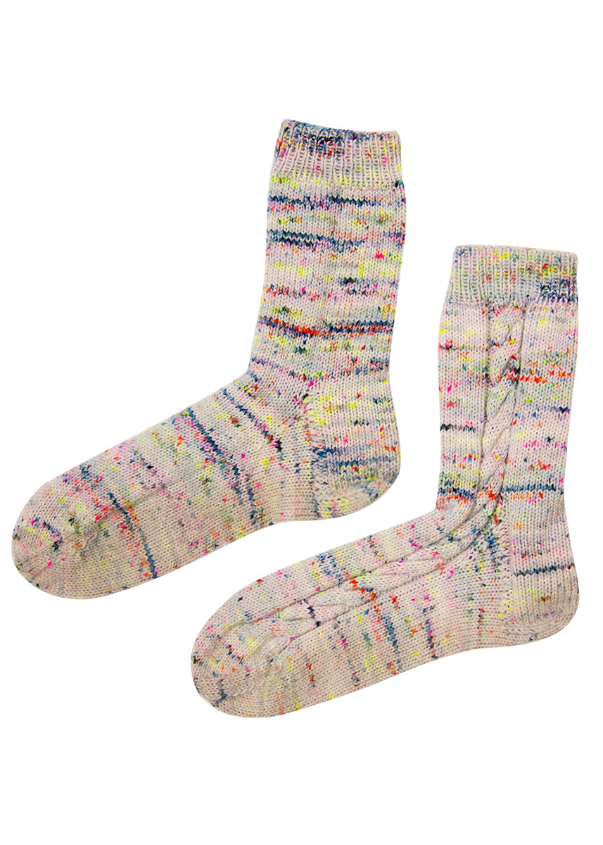 Lana Grossa Meilenweit Merino hand-dyed (80% ren ny ull, 20% polyamid, löplängd 420 m/100 g), 100 g ljus grå/gulgrön/pink/mörk petrol/svartgrön (färg 302), strumpstickor nr. 3 och 1 hjälpsticka.