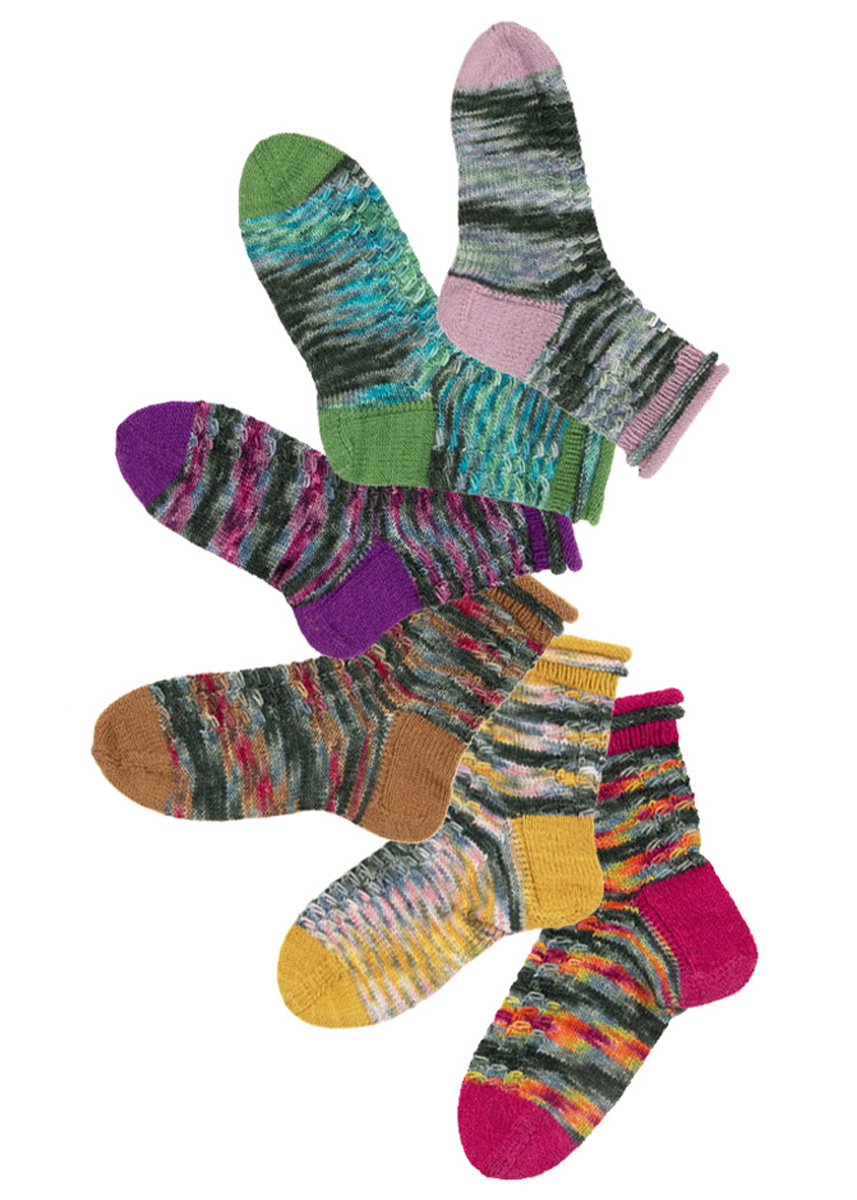 Model A: Lana Grossa-kvalitet ”Meilenweit 100G Merino new effects” (80 % ren ny uld (merino), 20 % polyamid, løbelængde = ca. 420 m / 100 gr.): 100 gr Anuj (fv 614) og Lana Grossa ”Meilenweit 100G Merino” (75% ren ny uld (merino), 25 % polyamid, løbelængde 420 m / 100 gr): 100 gr sennep (fv 2418). Model B: Lana Grossa-kvalitet ”Meilenweit 100G Merino new effects” (80 % ren ny uld (merino), 20 % polyamid, løbelængde = ca. 420 m / 100 gr.): 100 gr Angad (fv 615) og Lana Grossa ”Meilenweit 50G Cashmere” (70% ren ny uld (superwash), 25 % polyamid, 5 % cashmere, løbelængde 210 m / 50 gr): 50 gr nougat (fv 47). Model C: Lana Grossa-kvalitet ”Meilenweit 100G Merino new effects” (80 % ren ny uld (merino), 20 % polyamid, løbelængde = ca. 420 m / 100 gr.): 100 gr Vinod (fv 611) og Lana Grossa ”Meilenweit 50G Cashmere” (70% ren ny uld (superwash), 25 % polyamid, 5 % cashmere, løbelængde 210 m / 50 gr): 50 gr pastelrosa (fv 36). Model D: Lana Grossa-kvalitet ”Meilenweit 100G Merino new effects” (80 % ren ny uld (merino), 20 % polyamid, løbelængde = ca. 420 m / 100 gr.): 100 gr Sanjay (fv 612) og Lana Grossa ”Meilenweit 100G Merino” (75% ren ny uld (merino), 25 % polyamid, løbelængde 420 m / 100 gr): 100 gr grøn (fv 2417). Model E: Lana Grossa-kvalitet ”Meilenweit 100G Merino new effects” (80 % ren ny uld (merino), 20 % polyamid, løbelængde = ca. 420 m / 100 gr.): 100 gr Vivek (fv 613) og Lana Grossa ”Meilenweit 50G” (80% ren ny uld, 20 % polyamid, løbelængde 210 m / 50 gr): 50 gr violet (fv 1361). Model F: Lana Grossa-kvalitet ”Meilenweit 100G Merino new effects” (80 % ren ny uld (merino), 20 % polyamid, løbelængde = ca. 420 m / 100 gr.): 100 gr Vipin (fv 616) og Lana Grossa ”Meilenweit 50G” (80% ren ny uld, 20 % polyamid, løbelængde 210 m / 50 gr): 50 gr pink (fv 1313). Til alle modeller: 2 x et strømpepindesæt nr. 2½.