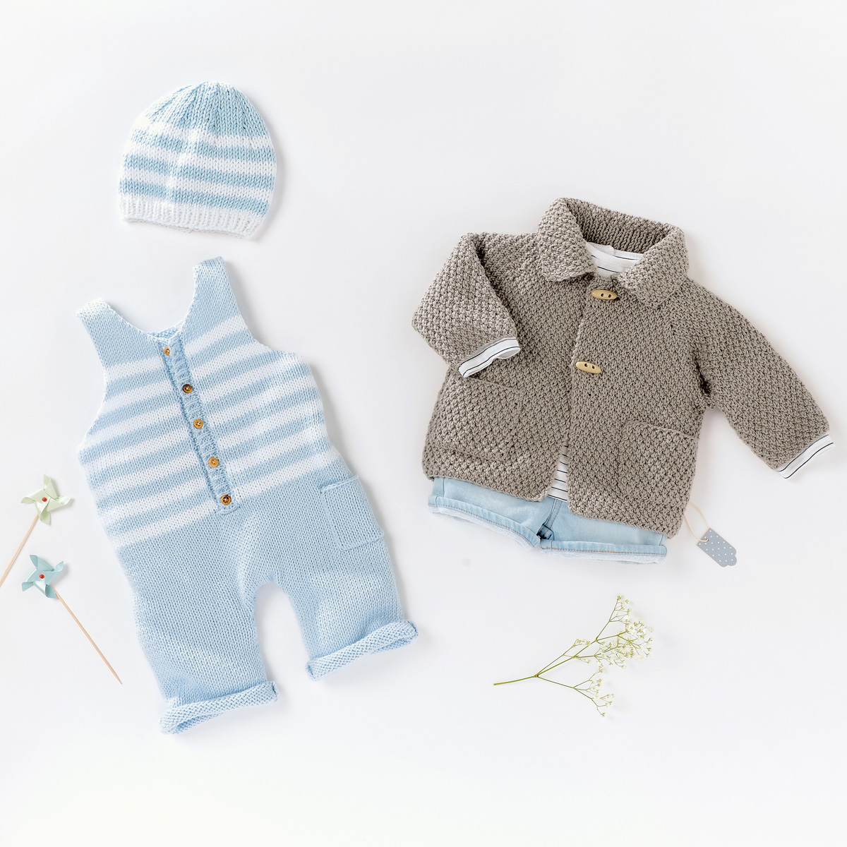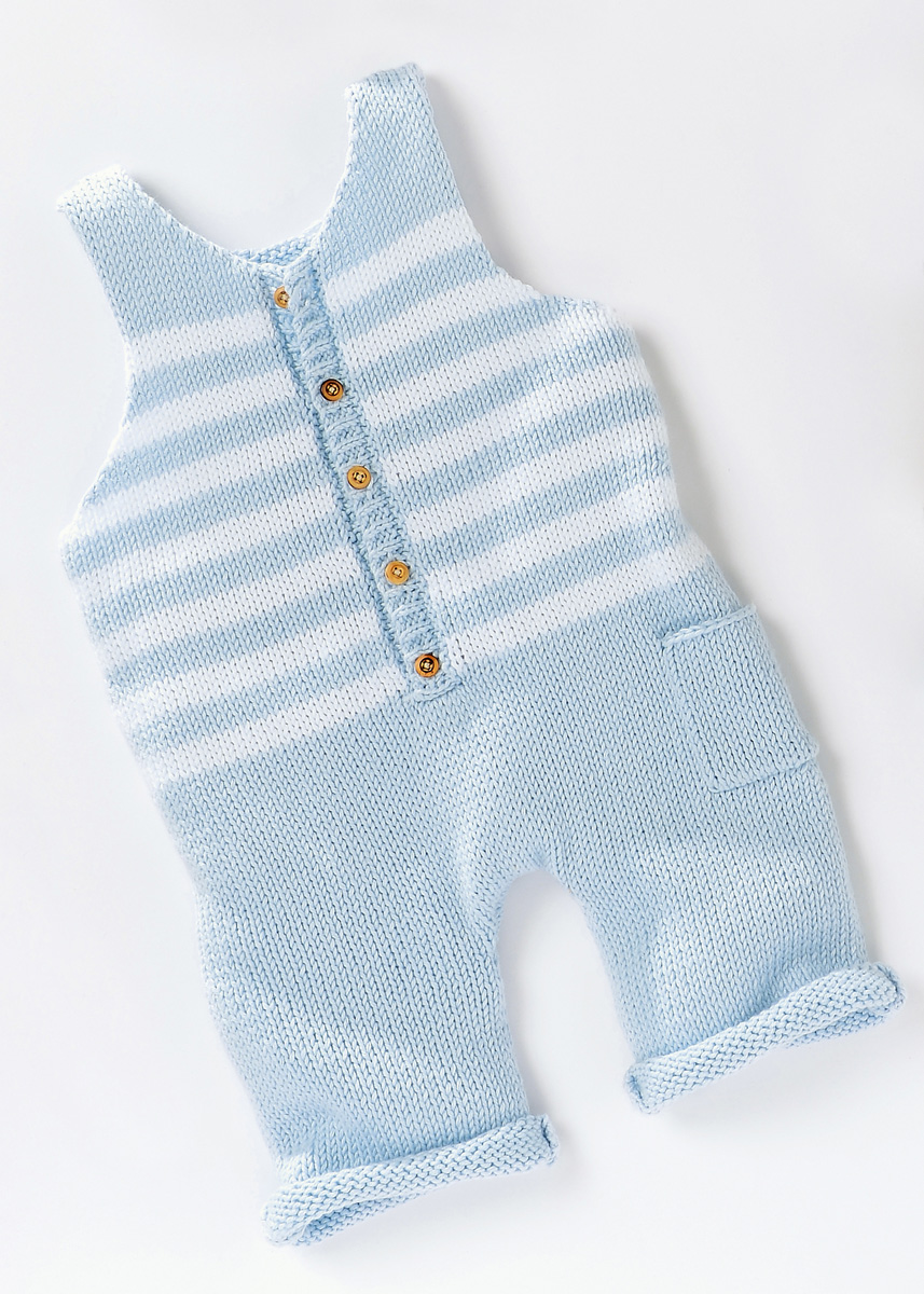 Lana Grossa-kvalitet ”Soft Cotton” (70 % bomuld, 30 % polyakryl, løbelængde = ca. 140 m / 50 gr.): 100(150-150-200) gr lyseblå (fv 8) og 50 gr hvid (fv 10), strikkepinde nr. 3 og 3½, 5 knapper 10 mm Ø